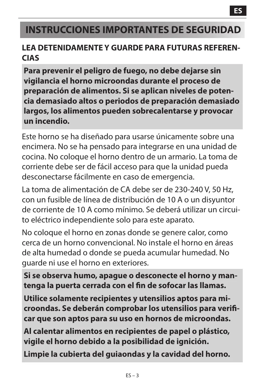 LEA DETENIDAMENTE Y GUARDE PARA FUTURAS REFERENCIAS Para prevenir el peligro de fuego, no debe dejarse sin vigilancia el horno microondas durante el proceso de preparación de alimentos. Si se aplican niveles de potencia demasiado altos o periodos de preparación demasiado largos, los alimentos pueden sobrecalentarse y provocar un incendio. Este horno se ha diseñado para usarse únicamente sobre una encimera. No se ha pensado para integrarse en una unidad de cocina. No coloque el horno dentro de un armario. La toma de corriente debe ser de fácil acceso para que la unidad pueda desconectarse fácilmente en caso de emergencia. La toma de alimentación de CA debe ser de 230-240 V, 50 Hz, con un fusible de línea de distribución de 10 A o un disyuntor de corriente de 10 A como mínimo. Se deberá utilizar un circuito eléctrico independiente solo para este aparato. No coloque el horno en zonas donde se genere calor, como cerca de un horno convencional. No instale el horno en áreas de alta humedad o donde se pueda acumular humedad. No guarde ni use el horno en exteriores. Si se observa humo, apague o desconecte el horno y mantenga la puerta cerrada con el fin de sofocar las llamas. Utilice solamente recipientes y utensilios aptos para microondas. Se deberán comprobar los utensilios para verificar que son aptos para su uso en hornos de microondas. Al calentar alimentos en recipientes de papel o plástico, vigile el horno debido a la posibilidad de ignición. Limpie la cubierta del guiaondas y la cavidad del horno. ES – 3 Estos elementos deben estar secos y no contener grasa. La grasa acumulada puede recalentarse y provocar humo o incendios. No coloque materiales inflamables cerca del horno o los orificios de ventilación. No bloquee los orificios de ventilación. Extraiga todos los sellos metálicos, cierres con alambre, etc., de los alimentos y de los alimentos envasados. Los arcos eléctricos en superficies metálicas pueden provocar incendios. No use el horno microondas para calentar aceite para freír. La temperatura no se puede controlar y el aceite puede incendiarse. Cuando prepare palomitas de maíz, utilice solamente fabricantes especializados en palomitas para microondas. No almacene alimentos u otros artículos dentro del horno. Compruebe la configuración después de encender el horno para asegurarse de que el aparato funciona como se desea. No deje el horno sin atender mientras se usa. Para evitar el calentamiento excesivo y un posible incendio, se debe prestar atención especial al preparar o recalentar alimentos con un contenido alto de azúcar o grasa, por ejemplo, salchichas, pasteles o pudin de Navidad. Consulte las sugerencias correspondientes en el manual de funcionamiento. Para evitar la posibilidad de lesiones. ADVERTENCIA: No use el horno si está dañado o no funciona correctamente. Compruebe los siguientes elementos antes de usarlo: a) Asegúrese de que la puerta está correctamente cerrada y de que no esté desalineada o deformada. b) Asegúrese de que las bisagras y las cerraduras de seguridad de la puerta no están rotas ni sueltas. c) Asegúrese de que las juntas de las puertas y superficies de sellado no están dañadas. ES – 4