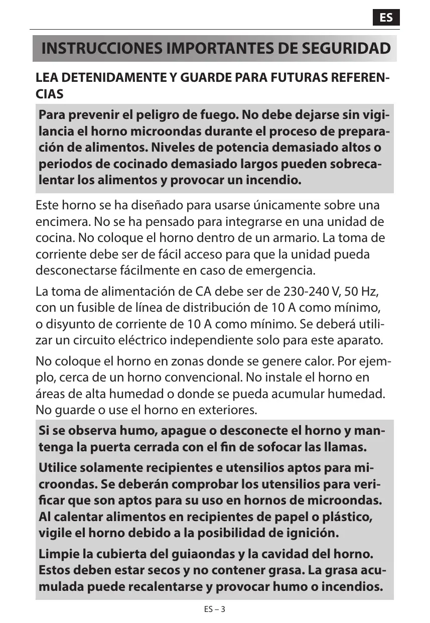 BLOQUEO PARA NIÑOS 20 LIMPIEZA Y MANTENIMIENTO 21 UTENSILIOS ADECUADOS PARA EL HORNO22 áreas de alta humedad o donde se pueda acumular humedad. No guarde o use el horno en exteriores. Si se observa humo, apague o desconecte el horno y mantenga la puerta cerrada con el fin de sofocar las llamas. Utilice solamente recipientes e utensilios aptos para microondas. Se deberán comprobar los utensilios para verificar que son aptos para su uso en hornos de microondas. Al calentar alimentos en recipientes de papel o plástico, vigile el horno debido a la posibilidad de ignición. Limpie la cubierta del guiaondas y la cavidad del horno. Estos deben estar secos y no contener grasa. La grasa acumulada puede recalentarse y provocar humo o incendios. ES – 3 Compruebe lo siguiente antes de usar: a) Compruebe que la puerta está correctamente cerrada y asegúrese de que no esté desalineada o deformada. b) Compruebe que las bisagras y las cerraduras de seguridad de la puerta no están rotas ni sueltas. c) Asegúrese de que las juntas de las puertas y superficies de sellado no están dañadas. d) Asegúrese de que interior de la cavidad del horno o la puerta no presentan abolladuras. e) Asegúrese de que el cable de alimentación y el enchufe no estén dañados. Si las juntas de la puerta o la puerta están dañadas, no debe ES – 4