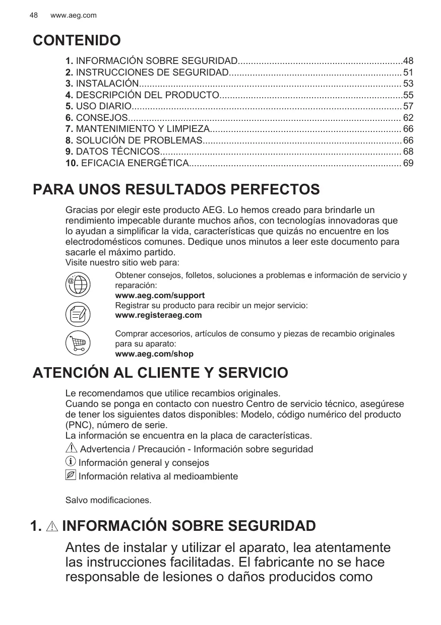 CONTENIDO 1. INFORMACIÓN SOBRE SEGURIDAD48 2. INSTRUCCIONES DE SEGURIDAD 51 3. INSTALACIÓN 53 4. DESCRIPCIÓN DEL PRODUCTO55 5. USO DIARIO 57 6. CONSEJOS 62 7. MANTENIMIENTO Y LIMPIEZA 66 8. SOLUCIÓN DE PROBLEMAS 66 9. DATOS TÉCNICOS 68 10. EFICACIA ENERGÉTICA 69