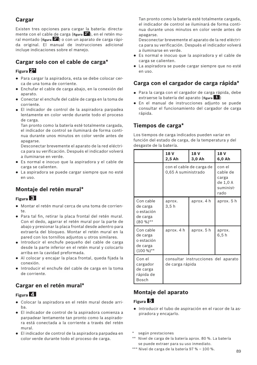 Cargar Existen tres opciones para cargar la bateria: directa- mente con el cable de carga (figura El), en el retén mu- ral montado (figura EM) o con un aparato de carga räpi- da original. El manual de instrucciones adicional incluye indicaciones sobre el manejo. Cargar solo con el cable de carga* Figura Para cargar la aspiradora, esta se debe colocar cer- ca de una toma de corriente. Enchufar el cable de carga abajo, en la conexién del aparato. Conectar el enchufe del cable de carga en la toma de corriente. El indicador de control de la aspiradora parpadea lentamente en color verde durante todo el proceso de carga. Tan pronto como la bateria esté totalmente cargada, el indicador de control se iluminarä de forma conti- nua durante unos minutos en color verde antes de apagarse Desconectar brevemente el aparato de la red eléct ca para su verificacién. Después el indicador volverä a iluminarse en verde Es normal e inocuo que la aspiradora y el cable de carga se calienten. La aspiradora se puede cargar siempre que no esté en uso. Montaje del retén mural* Figura EX + Montar el retén mural cerca de una toma de corrien- te. Para tal fin, retirar la placa frontal del retén mural Con el dedo, agarrar el retén mural por la parte de abajo y presionar la placa frontal desde adentro para extraerla del bloqueo. Montar el retén mural en la pared con los tornillos adjuntos u otros similares. Introducir el enchufe pequeño del cable de carga desde la parte inferior en el retén mural y colocarlo arriba en la cavidad preformada. Al colocar y encajar la placa frontal, queda fijada la conexiôn Introducir el enchufe del cable de carga en la toma de corriente Cargar en el retén mural* Figura EN + Colocar la aspiradora en el retén mural desde arri- ba. + Elindicador de control de la aspiradora comienza a parpadear lentamente tan pronto como la aspirado- ra esté conectada à la corriente a través del retén mural. Elindicador de control de la aspiradora parpadea en color verde durante todo el proceso de carga. Tan pronto como la bateria esté totalmente cargada, el indicador de control se iluminaré de forma conti- nua durante unos minutos en color verde antes de apagarse Desconectar brevemente el aparato de la red eléctri- ca para su verificaciôn. Después el indicador volverä a iluminarse en verde Es normal e inocuo que la aspiradora y el cable de carga se calienten. La aspiradora se puede cargar siempre que no esté en uso Carga con el cargador de carga râpida* Para la carga con el cargador de carga répida, debe extraerse la bateria del aparato (figura EM) En el manual de instrucciones adjunto se puede consultar el funcionamiento del cargador de carga répida. Tiempos de carga* Los tiempos de carga indicados pueden variar en funcién del estado de carga, de la temperatura y del desgaste de la bateria. 18V 18V 18V 2,5 Ah 3,0 Ah 6,0 Ah con el cable de carga de | con el 0,65 À suministrado cable de carga de 1,0 A suminist- rado Con cable | aprox aprox. 4h |aprox. 5h de carga 3,5h o estaciôn de carga (80 %)** Con cable | aprox.4h | aprox. 5h | aprox de carga 65h o estacién de carga (100 %)°* Con el consultar instrucciones del aparato cargador | de carga räpida de carga répida de Bosch Montaje del aparato Figura ER +_Introducir el tubo de aspiracién en el racor de la as- piradora y encajarlo. segün prestaciones ** Nivel de carga de la baterla aprox. 80 %. La bateria se puede extraer para su uso inmediato. **+ Nivel de carga de la bateria 97 % — 100 % 8