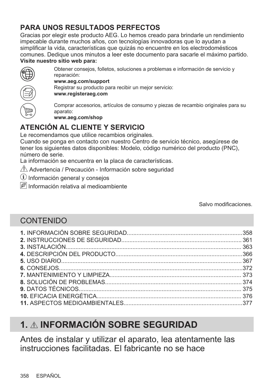 Cuando se ponga en contacto con nuestro Centro de servicio técnico, asegúrese de tener los siguientes datos disponibles: Modelo, código numérico del producto (PNC), número de serie. La información se encuentra en la placa de características. Advertencia / Precaución - Información sobre seguridad Información general y consejos Información relativa al medioambiente Salvo modificaciones.