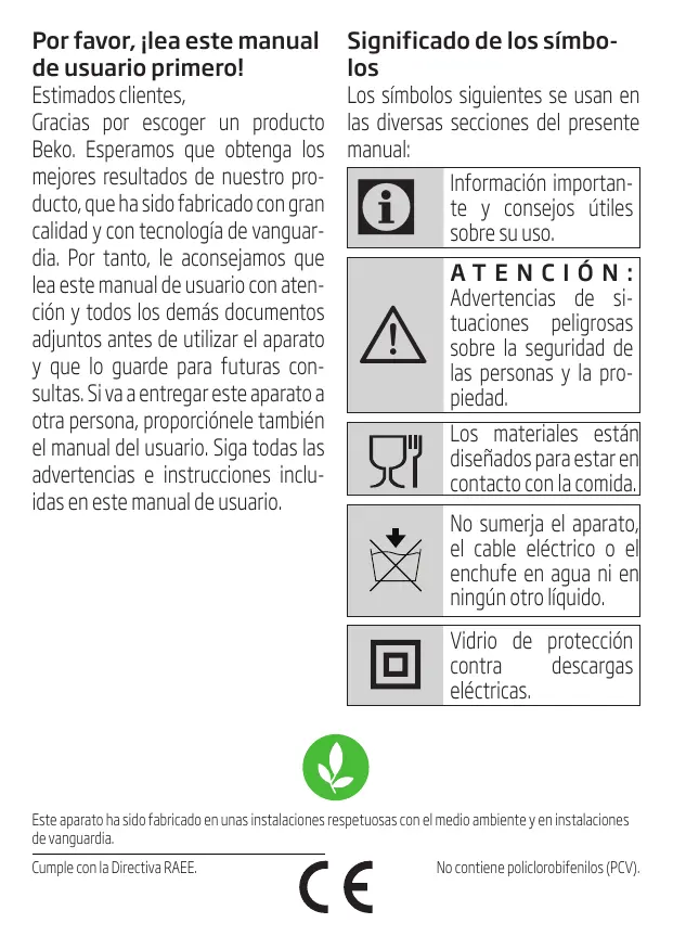 Por favor, ¡lea este manual de usuario primero! Estimados clientes, Gracias por escoger un producto Beko. Esperamos que obtenga los mejores resultados de nuestro producto, que ha sido fabricado con gran calidad y con tecnología de vanguardia. Por tanto, le aconsejamos que lea este manual de usuario con atención y todos los demás documentos adjuntos antes de utilizar el aparato y que lo guarde para futuras consultas. Si va a entregar este aparato a otra persona, proporciónele también el manual del usuario. Siga todas las advertencias e instrucciones incluidas en este manual de usuario.
