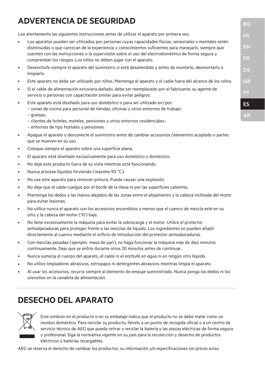 Este símbolo en el producto o en su embalaje indica que el producto no se debe tratar como un residuo doméstico. Para reciclar su producto, llévelo a un punto de recogida oficial o a un centro de servicio técnico de AEG que pueda retirar y reciclar la batería y las piezas eléctricas de forma segura y profesional. Siga la normativa vigente en su país para la recolección y desecho de productos eléctricos y baterías recargables. AEG se reserva el derecho de cambiar los productos, su información y/o especificaciones sin previo aviso.