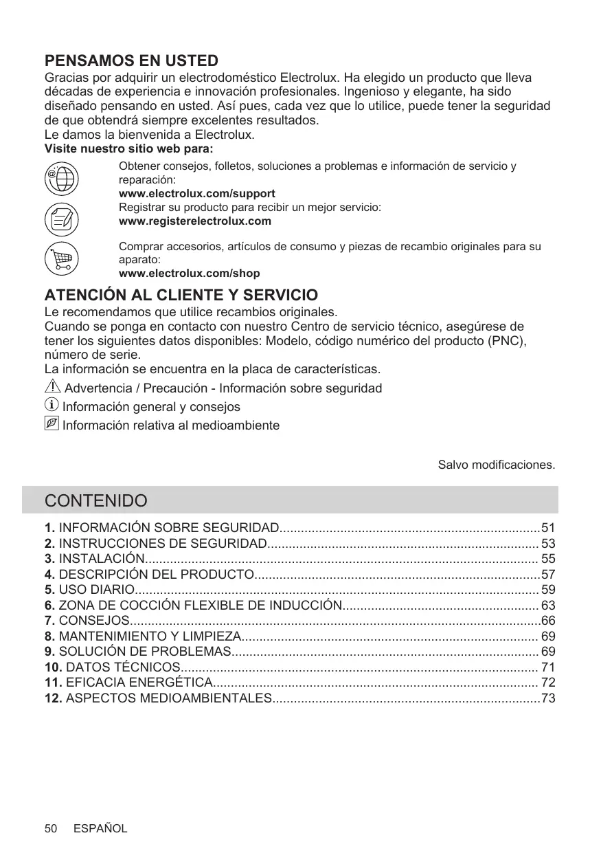 Le recomendamos que utilice recambios originales. Cuando se ponga en contacto con nuestro Centro de servicio técnico, asegúrese de tener los siguientes datos disponibles: Modelo, código numérico del producto (PNC), número de serie. La información se encuentra en la placa de características. Advertencia / Precaución - Información sobre seguridad Información general y consejos Información relativa al medioambiente Salvo modificaciones.