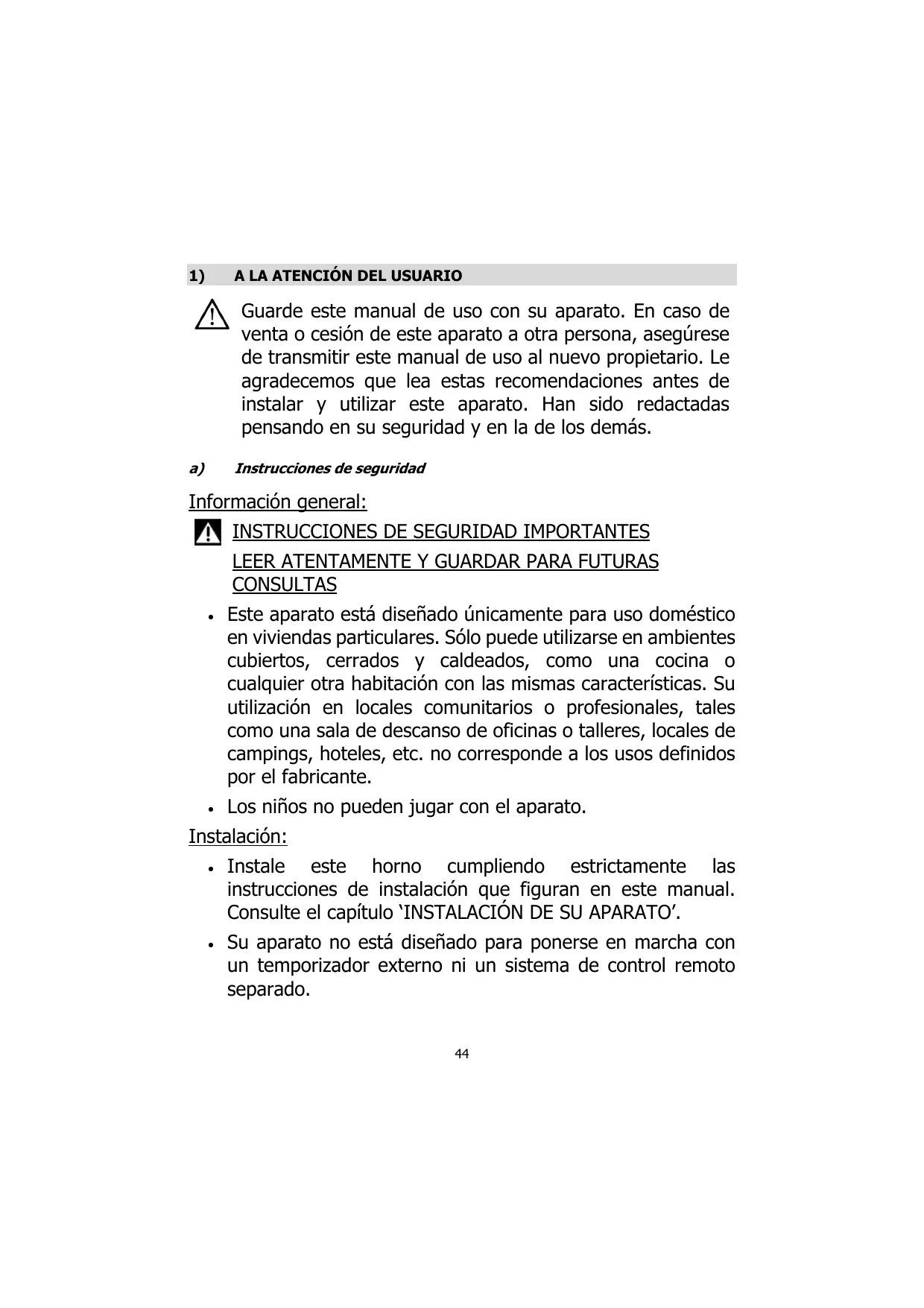 A LA ATENCIÓN DEL USUARIO Guarde este manual de uso con su aparato. En caso de venta o cesión de este aparato a otra persona, asegúrese de transmitir este manual de uso al nuevo propietario. Le agradecemos que lea estas recomendaciones antes de instalar y utilizar este aparato. Han sido redactadas pensando en su seguridad y en la de los demás. a)