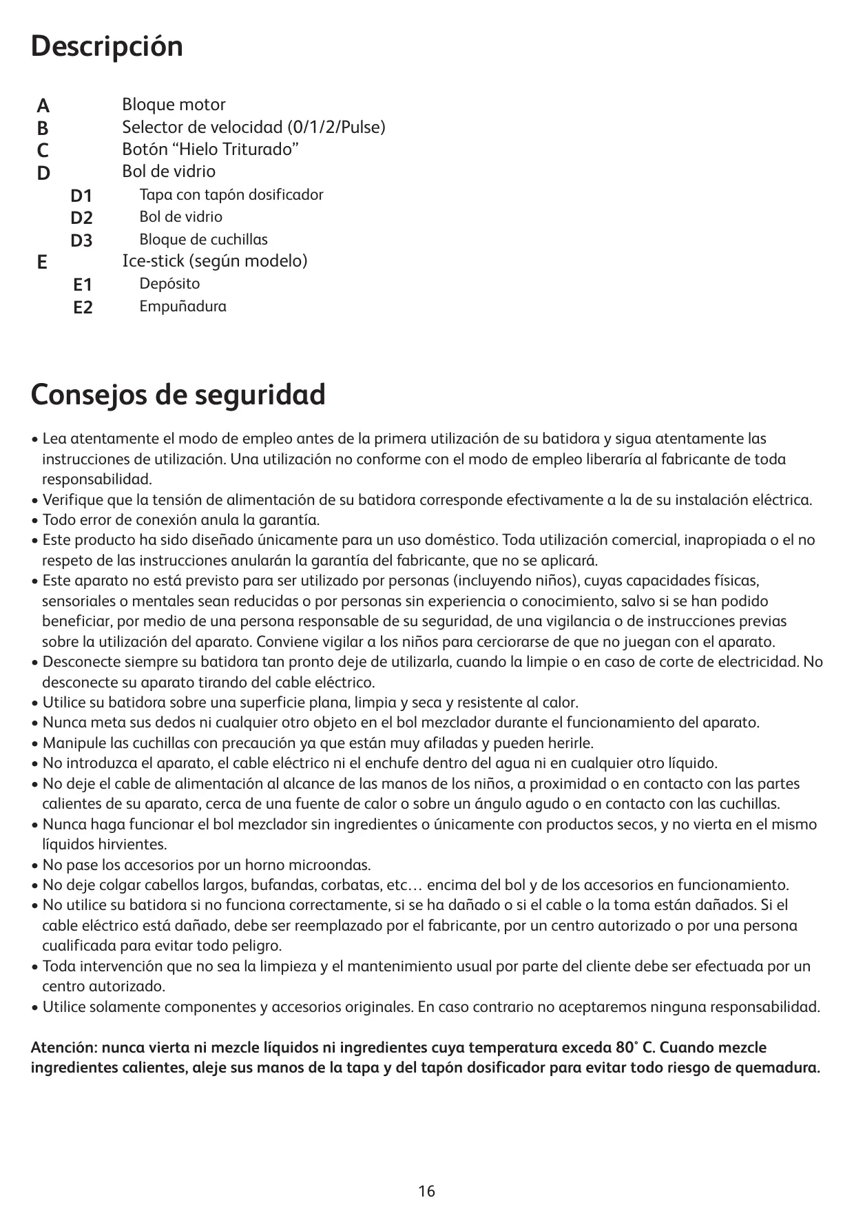 • Lea atentamente el modo de empleo antes de la primera utilización de su batidora y sigua atentamente las instrucciones de utilización. Una utilización no conforme con el modo de empleo liberaría al fabricante de toda responsabilidad. • Verifique que la tensión de alimentación de su batidora corresponde efectivamente a la de su instalación eléctrica. • Todo error de conexión anula la garantía. • Este producto ha sido diseñado únicamente para un uso doméstico. Toda utilización comercial, inapropiada o el no respeto de las instrucciones anularán la garantía del fabricante, que no se aplicará. • Este aparato no está previsto para ser utilizado por personas (incluyendo niños), cuyas capacidades físicas, sensoriales o mentales sean reducidas o por personas sin experiencia o conocimiento, salvo si se han podido beneficiar, por medio de una persona responsable de su seguridad, de una vigilancia o de instrucciones previas sobre la utilización del aparato. Conviene vigilar a los niños para cerciorarse de que no juegan con el aparato. • Desconecte siempre su batidora tan pronto deje de utilizarla, cuando la limpie o en caso de corte de electricidad. No desconecte su aparato tirando del cable eléctrico. • Utilice su batidora sobre una superficie plana, limpia y seca y resistente al calor. • Nunca meta sus dedos ni cualquier otro objeto en el bol mezclador durante el funcionamiento del aparato. • Manipule las cuchillas con precaución ya que están muy afiladas y pueden herirle. • No introduzca el aparato, el cable eléctrico ni el enchufe dentro del agua ni en cualquier otro líquido. • No deje el cable de alimentación al alcance de las manos de los niños, a proximidad o en contacto con las partes calientes de su aparato, cerca de una fuente de calor o sobre un ángulo agudo o en contacto con las cuchillas. • Nunca haga funcionar el bol mezclador sin ingredientes o únicamente con productos secos, y no vierta en el mismo líquidos hirvientes. • No pase los accesorios por un horno microondas. • No deje colgar cabellos largos, bufandas, corbatas, etc… encima del bol y de los accesorios en funcionamiento. • No utilice su batidora si no funciona correctamente, si se ha dañado o si el cable o la toma están dañados. Si el cable eléctrico está dañado, debe ser reemplazado por el fabricante, por un centro autorizado o por una persona cualificada para evitar todo peligro. • Toda intervención que no sea la limpieza y el mantenimiento usual por parte del cliente debe ser efectuada por un centro autorizado. • Utilice solamente componentes y accesorios originales. En caso contrario no aceptaremos ninguna responsabilidad. Atención: nunca vierta ni mezcle líquidos ni ingredientes cuya temperatura exceda 80° C. Cuando mezcle ingredientes calientes, aleje sus manos de la tapa y del tapón dosificador para evitar todo riesgo de quemadura.
