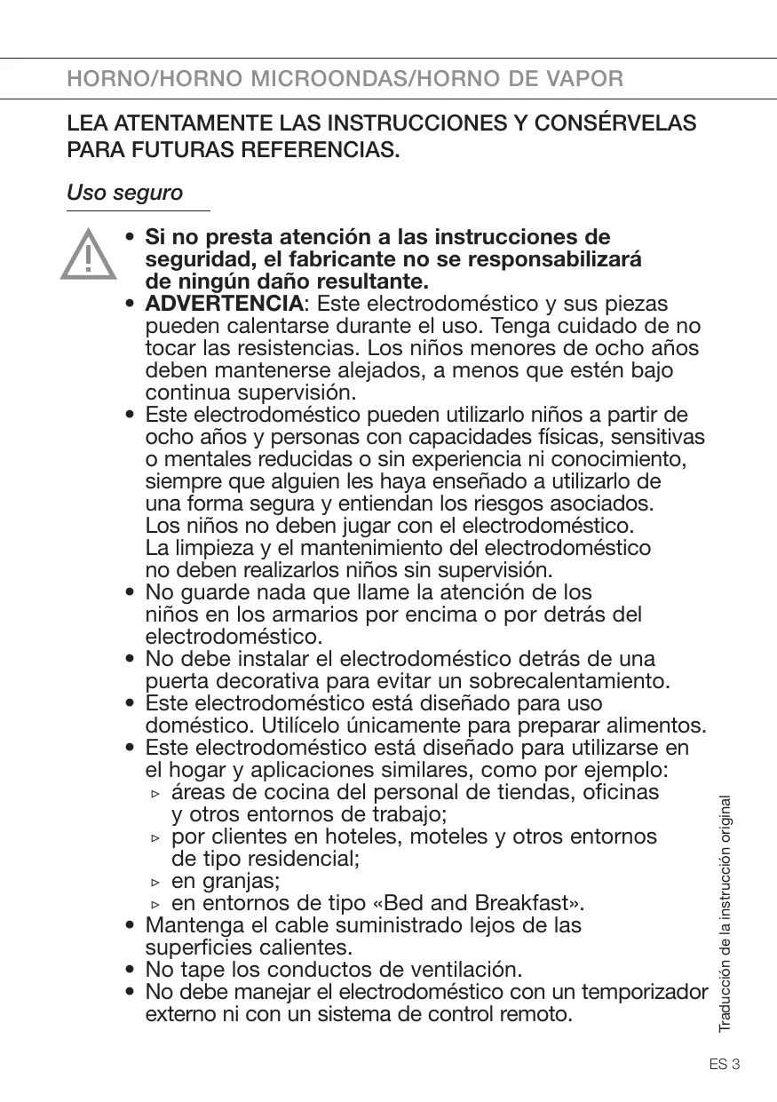 - No debe manejar el electrodoméstico con un temporizador externo ni con un sistema de control remoto. Traducción de la instrucción original Uso seguro ES 3