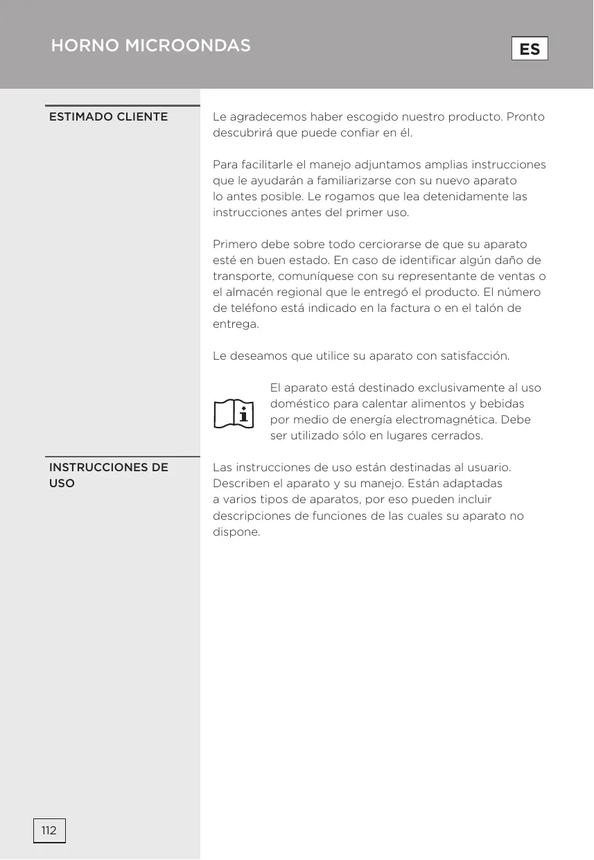 Le agradecemos haber escogido nuestro producto. Pronto descubrirá que puede confiar en él. Para facilitarle el manejo adjuntamos amplias instrucciones que le ayudarán a familiarizarse con su nuevo aparato lo antes posible. Le rogamos que lea detenidamente las instrucciones antes del primer uso. Primero debe sobre todo cerciorarse de que su aparato esté en buen estado. En caso de identificar algún daño de transporte, comuníquese con su representante de ventas o el almacén regional que le entregó el producto. El número de teléfono está indicado en la factura o en el talón de entrega. Le deseamos que utilice su aparato con satisfacción. El aparato está destinado exclusivamente al uso doméstico para calentar alimentos y bebidas por medio de energía electromagnética. Debe ser utilizado sólo en lugares cerrados. INSTRUCCIONES DE USO