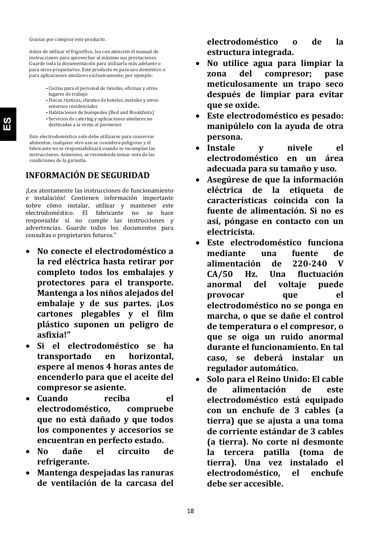 No utilice agua para limpiar la zona del compresor; pase meticulosamente un trapo seco después de limpiar para evitar que se oxide. Este electrodoméstico es pesado: manipúlelo con la ayuda de otra persona. Instale y nivele el electrodoméstico en un área adecuada para su tamaño y uso. Asegúrese de que la información eléctrica de la etiqueta de características coincida con la fuente de alimentación. Si no es así, póngase en contacto con un electricista. Este electrodoméstico funciona mediante una fuente de alimentación de 220-240 V CA/50 Hz. Una fluctuación anormal del voltaje puede provocar que el electrodoméstico no se ponga en marcha, o que se dañe el control de temperatura o el compresor, o que se oiga un ruido anormal durante el funcionamiento. En tal caso, se deberá instalar un regulador automático. Solo para el Reino Unido: El cable de alimentación de este electrodoméstico está equipado con un enchufe de 3 cables (a tierra) que se ajusta a una toma de corriente estándar de 3 cables (a tierra). No corte ni desmonte la tercera patilla (toma de tierra). Una vez instalado el electrodoméstico, el enchufe debe ser accesible.