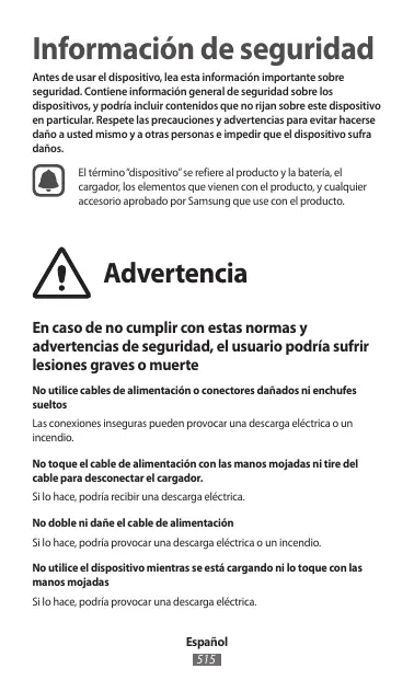 Antes de usar el dispositivo, lea esta información importante sobre seguridad. Contiene información general de seguridad sobre los dispositivos, y podría incluir contenidos que no rijan sobre este dispositivo en particular. Respete las precauciones y advertencias para evitar hacerse daño a usted mismo y a otras personas e impedir que el dispositivo sufra daños. El término “dispositivo” se refiere al producto y la batería, el cargador, los elementos que vienen con el producto, y cualquier accesorio aprobado por Samsung que use con el producto.