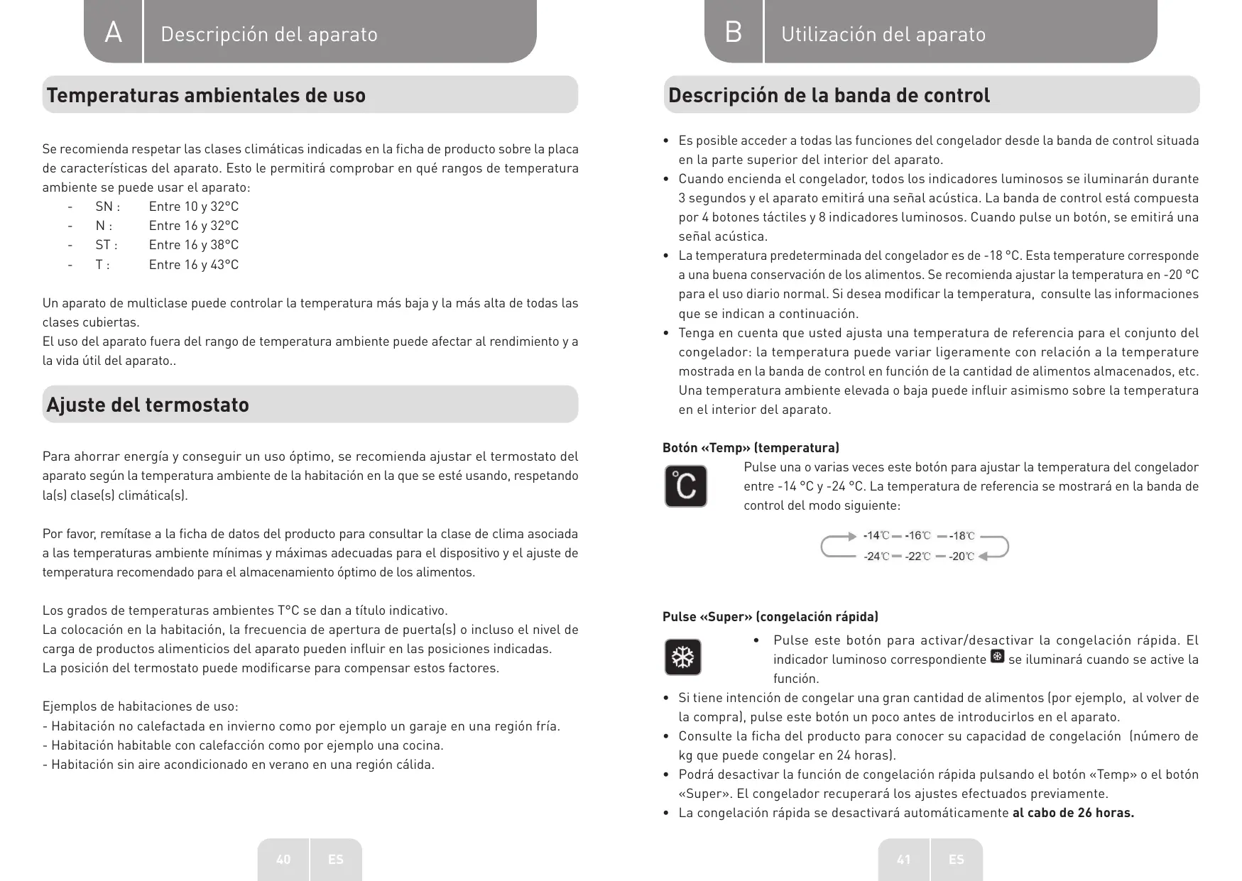 • Tenga en cuenta que usted ajusta una temperatura de referencia para el conjunto del congelador: la temperatura puede variar ligeramente con relación a la temperature mostrada en la banda de control en función de la cantidad de alimentos almacenados, etc. Una temperatura ambiente elevada o baja puede influir asimismo sobre la temperatura en el interior del aparato. Botón «Temp» (temperatura) Pulse una o varias veces este botón para ajustar la temperatura del congelador entre -14 °C y -24 °C. La temperatura de referencia se mostrará en la banda de control del modo siguiente: Por favor, remítase a la ficha de datos del producto para consultar la clase de clima asociada a las temperaturas ambiente mínimas y máximas adecuadas para el dispositivo y el ajuste de temperatura recomendado para el almacenamiento óptimo de los alimentos. Los grados de temperaturas ambientes T°C se dan a título indicativo. La colocación en la habitación, la frecuencia de apertura de puerta(s) o incluso el nivel de carga de productos alimenticios del aparato pueden influir en las posiciones indicadas. La posición del termostato puede modificarse para compensar estos factores. Ejemplos de habitaciones de uso: - Habitación no calefactada en invierno como por ejemplo un garaje en una región fría. - Habitación habitable con calefacción como por ejemplo una cocina. - Habitación sin aire acondicionado en verano en una región cálida. Pulse «Super» (congelación rápida)