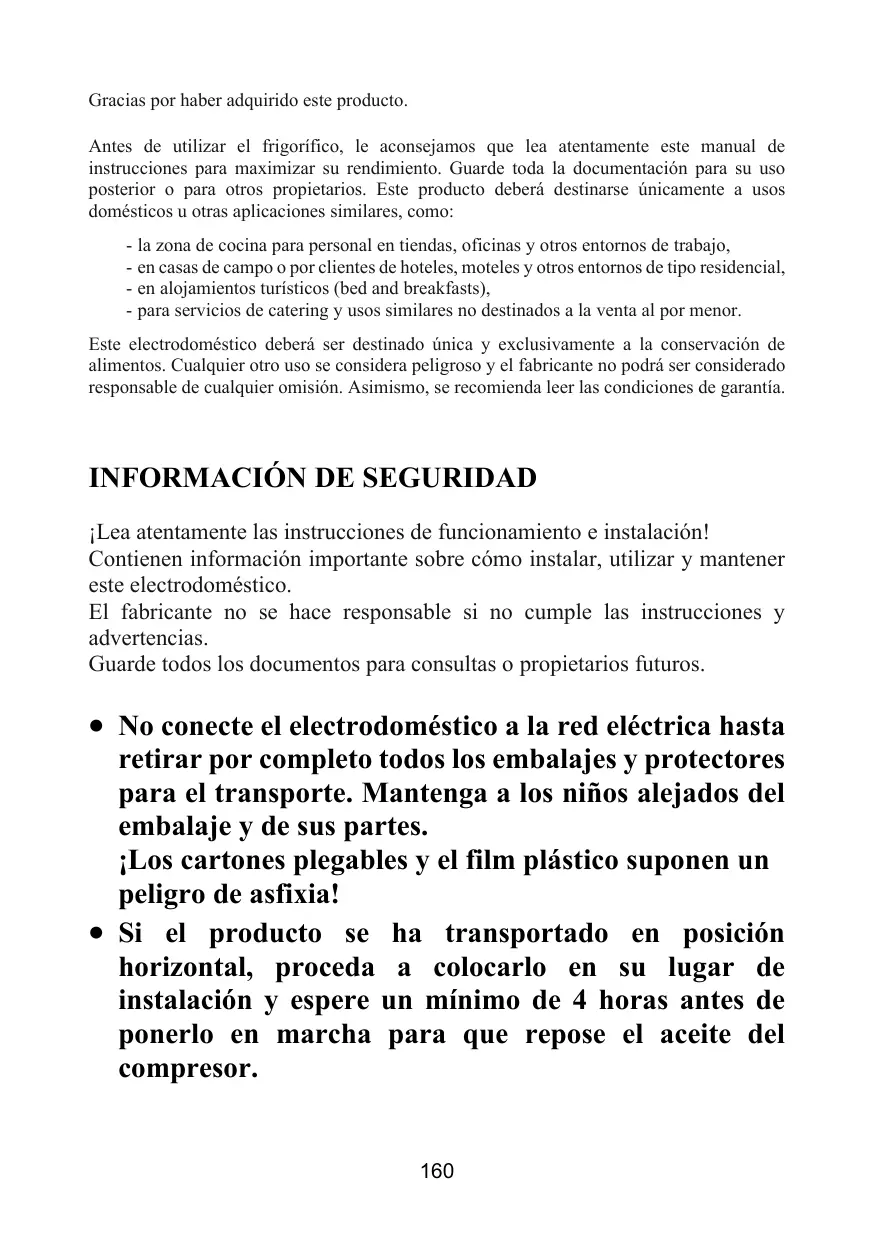 • No conecte el electrodoméstico a la red eléctrica hasta retirar por completo todos los embalajes y protectores para el transporte. Mantenga a los niños alejados del embalaje y de sus partes. ¡Los cartones plegables y el film plástico suponen un peligro de asfixia! • Si el producto se ha transportado en posición horizontal, proceda a colocarlo en su lugar de instalación y espere un mínimo de 4 horas antes de ponerlo en marcha para que repose el aceite del compresor. 160