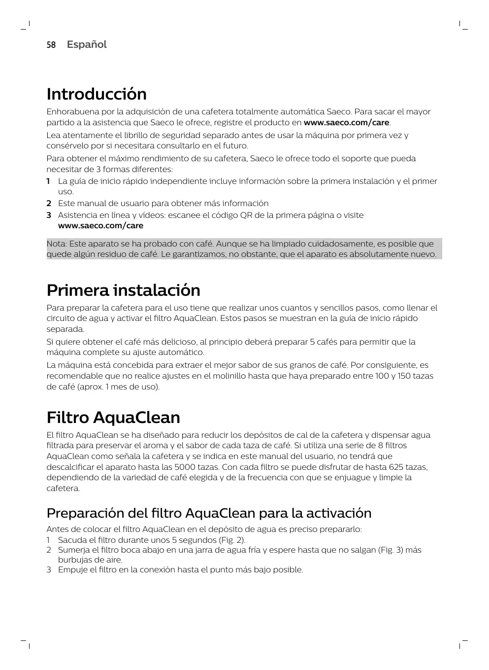 Español Introducción Enhorabuena por la adquisición de una cafetera totalmente automática Saeco. Para sacar el mayor partido a la asistencia que Saeco le ofrece, registre el producto en www.saeco.com/care. Lea atentamente el librillo de seguridad separado antes de usar la máquina por primera vez y consérvelo por si necesitara consultarlo en el futuro. Para obtener el máximo rendimiento de su cafetera, Saeco le ofrece todo el soporte que pueda necesitar de 3 formas diferentes: 1 La guía de inicio rápido independiente incluye información sobre la primera instalación y el primer uso. 2 Este manual de usuario para obtener más información 3 Asistencia en línea y vídeos: escanee el código QR de la primera página o visite www.saeco.com/care Nota: Este aparato se ha probado con café. Aunque se ha limpiado cuidadosamente, es posible que quede algún residuo de café. Le garantizamos, no obstante, que el aparato es absolutamente nuevo. Primera instalación Para preparar la cafetera para el uso tiene que realizar unos cuantos y sencillos pasos, como llenar el circuito de agua y activar el filtro AquaClean. Estos pasos se muestran en la guía de inicio rápido separada. Si quiere obtener el café más delicioso, al principio deberá preparar 5 cafés para permitir que la máquina complete su ajuste automático. La máquina está concebida para extraer el mejor sabor de sus granos de café. Por consiguiente, es recomendable que no realice ajustes en el molinillo hasta que haya preparado entre 100 y 150 tazas de café (aprox. 1 mes de uso). Filtro AquaClean El filtro AquaClean se ha diseñado para reducir los depósitos de cal de la cafetera y dispensar agua filtrada para preservar el aroma y el sabor de cada taza de café. Si utiliza una serie de 8 filtros AquaClean como señala la cafetera y se indica en este manual del usuario, no tendrá que descalcificar el aparato hasta las 5000 tazas. Con cada filtro se puede disfrutar de hasta 625 tazas, dependiendo de la variedad de café elegida y de la frecuencia con que se enjuague y limpie la cafetera. Preparación del filtro AquaClean para la activación Antes de colocar el filtro AquaClean en el depósito de agua es preciso prepararlo: 1 Sacuda el filtro durante unos 5 segundos (Fig. 2). 2 Sumerja el filtro boca abajo en una jarra de agua fría y espere hasta que no salgan (Fig. 3) más burbujas de aire. 3 Empuje el filtro en la conexión hasta el punto más bajo posible. Español