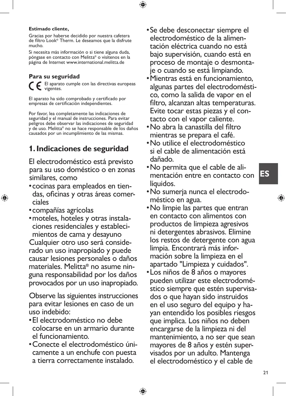 L‘appareil est conforme aux normes européennes en vigueur. L‘appareil a été contrôlé et certifié par des instituts de tests indépendants. Veuillez lire les consignes de sécurité et le mode d‘emploi dans leur intégralité. Afin d‘éviter tout danger, respectez les consignes de sécurité ainsi que le mode d‘emploi. Melitta® décline toute responsabilité en cas de dommages résultant d‘un non-respect des consignes.