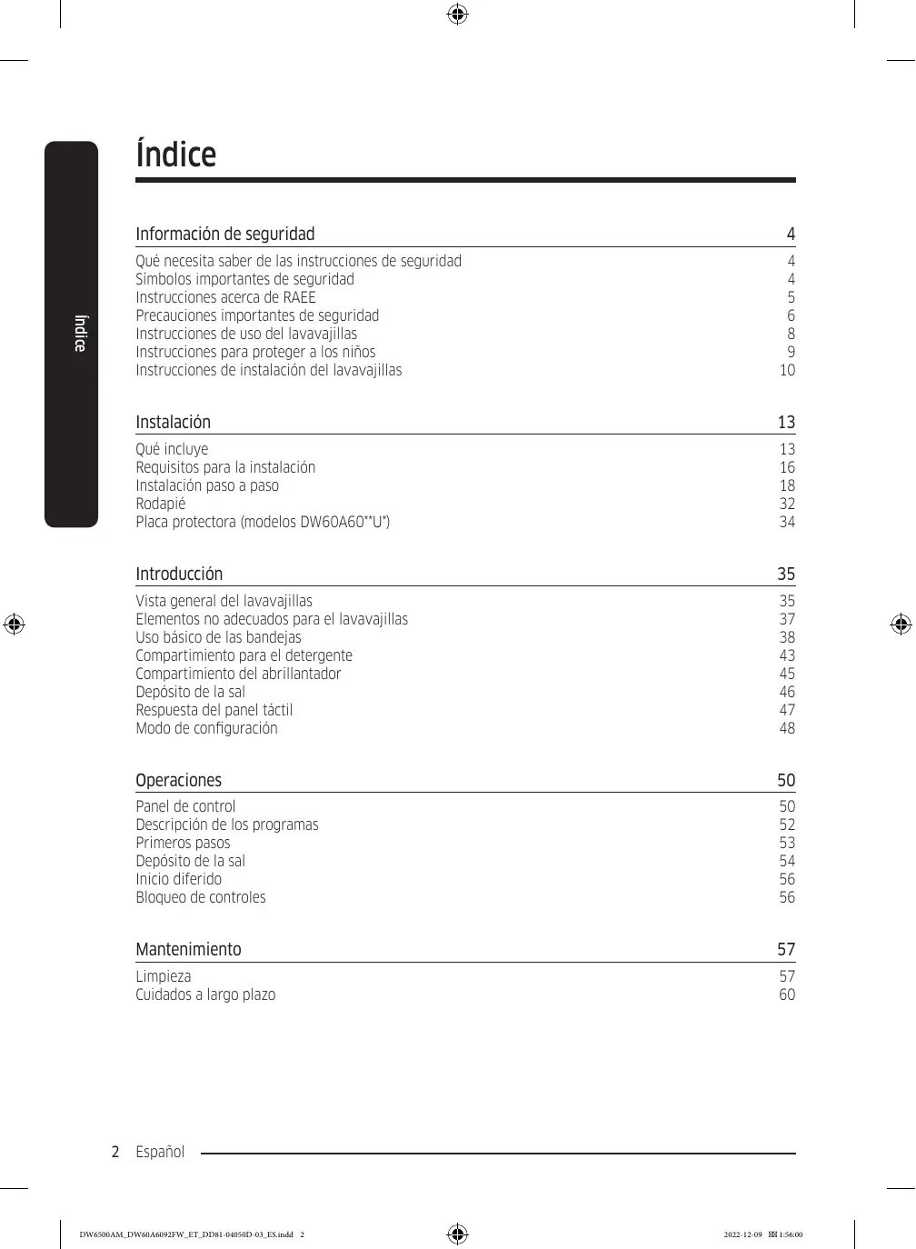 Símbolos importantes de seguridad Instrucciones acerca de RAEE Precauciones importantes de seguridad Instrucciones de uso del lavavajillas Instrucciones para proteger a los niños Instrucciones de instalación del lavavajillas