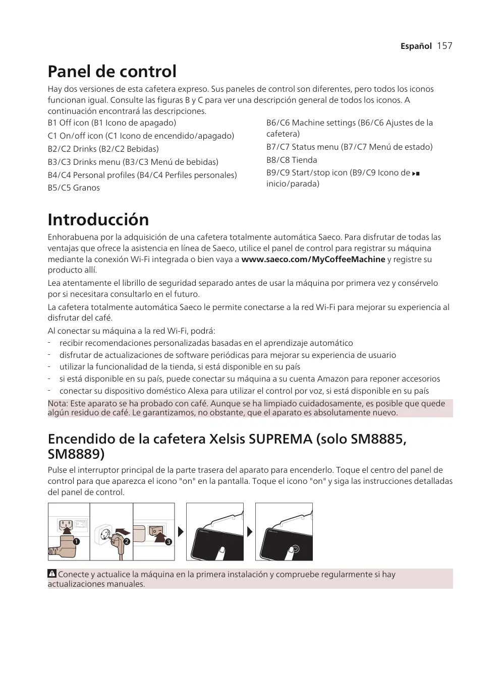 Enhorabuena por la adquisición de una cafetera totalmente automática Saeco. Para disfrutar de todas las ventajas que ofrece la asistencia en línea de Saeco, utilice el panel de control para registrar su máquina mediante la conexión Wi-Fi integrada o bien vaya a www.saeco.com/MyCoffeeMachine y registre su producto allí. Lea atentamente el librillo de seguridad separado antes de usar la máquina por primera vez y consérvelo por si necesitara consultarlo en el futuro. La cafetera totalmente automática Saeco le permite conectarse a la red Wi-Fi para mejorar su experiencia al disfrutar del café. Al conectar su máquina a la red Wi-Fi, podrá: - recibir recomendaciones personalizadas basadas en el aprendizaje automático - disfrutar de actualizaciones de software periódicas para mejorar su experiencia de usuario - utilizar la funcionalidad de la tienda, si está disponible en su país - si está disponible en su país, puede conectar su máquina a su cuenta Amazon para reponer accesorios - conectar su dispositivo doméstico Alexa para utilizar el control por voz, si está disponible en su país Nota: Este aparato se ha probado con café. Aunque se ha limpiado cuidadosamente, es posible que quede algún residuo de café. Le garantizamos, no obstante, que el aparato es absolutamente nuevo.