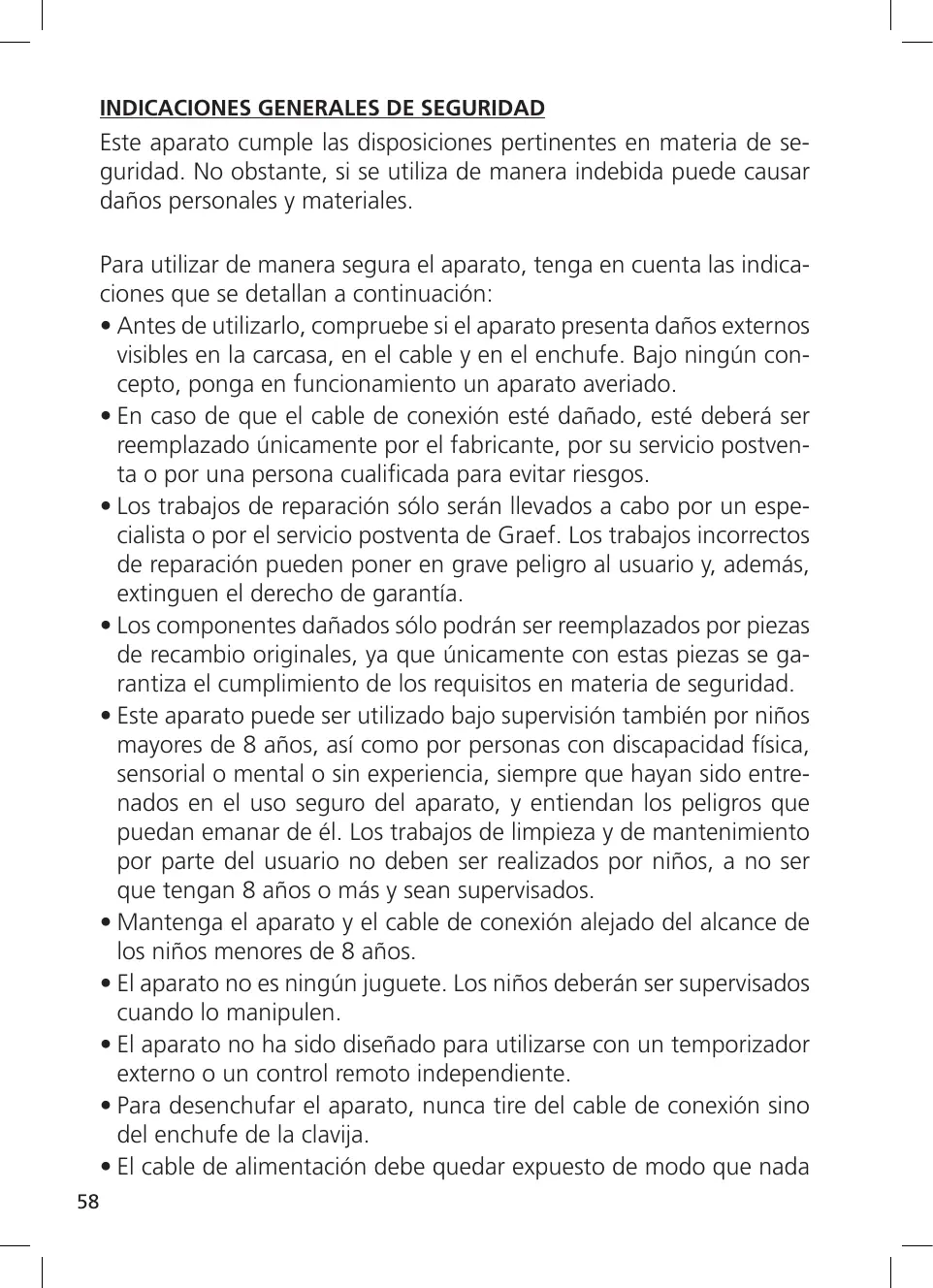 - Los trabajos de reparación sólo serán llevados a cabo por un especialista o por el servicio postventa de Graef. Los trabajos incorrectos de reparación pueden poner en grave peligro al usuario y, además, extinguen el derecho de garantía.