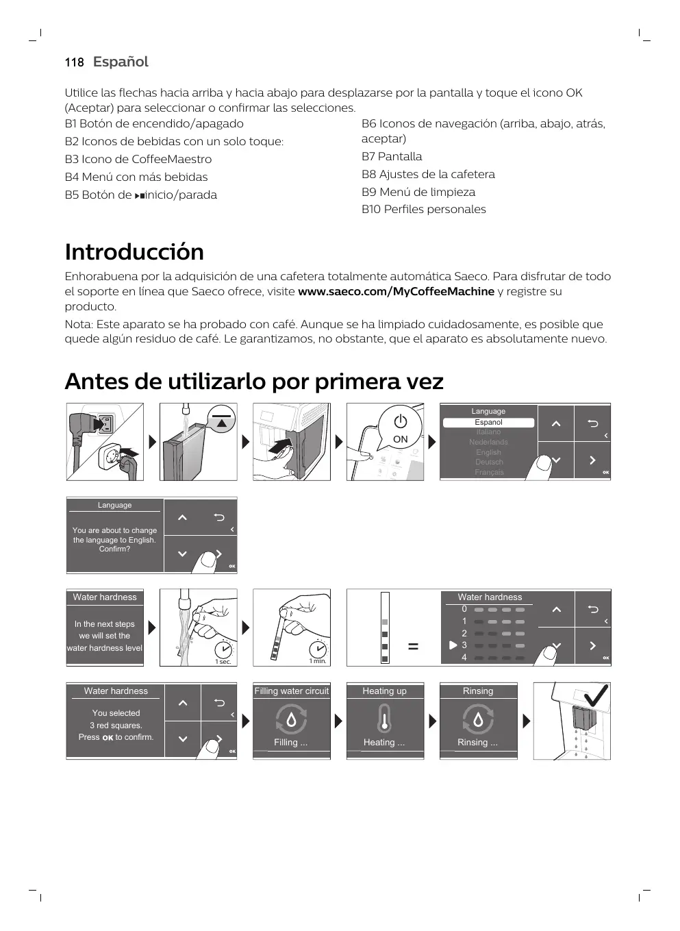 Enhorabuena por la adquisición de una cafetera totalmente automática Saeco. Para disfrutar de todo el soporte en línea que Saeco ofrece, visite www.saeco.com/MyCoffeeMachine y registre su producto. Nota: Este aparato se ha probado con café. Aunque se ha limpiado cuidadosamente, es posible que quede algún residuo de café. Le garantizamos, no obstante, que el aparato es absolutamente nuevo.