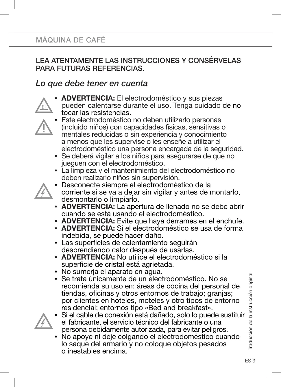 - Este electrodoméstico se ha diseñado para «hacer café expreso» y «bebidas calientes». Utilícelo con cuidado para evitar quemaduras por agua o chorros de vapor o por su uso inadecuado.