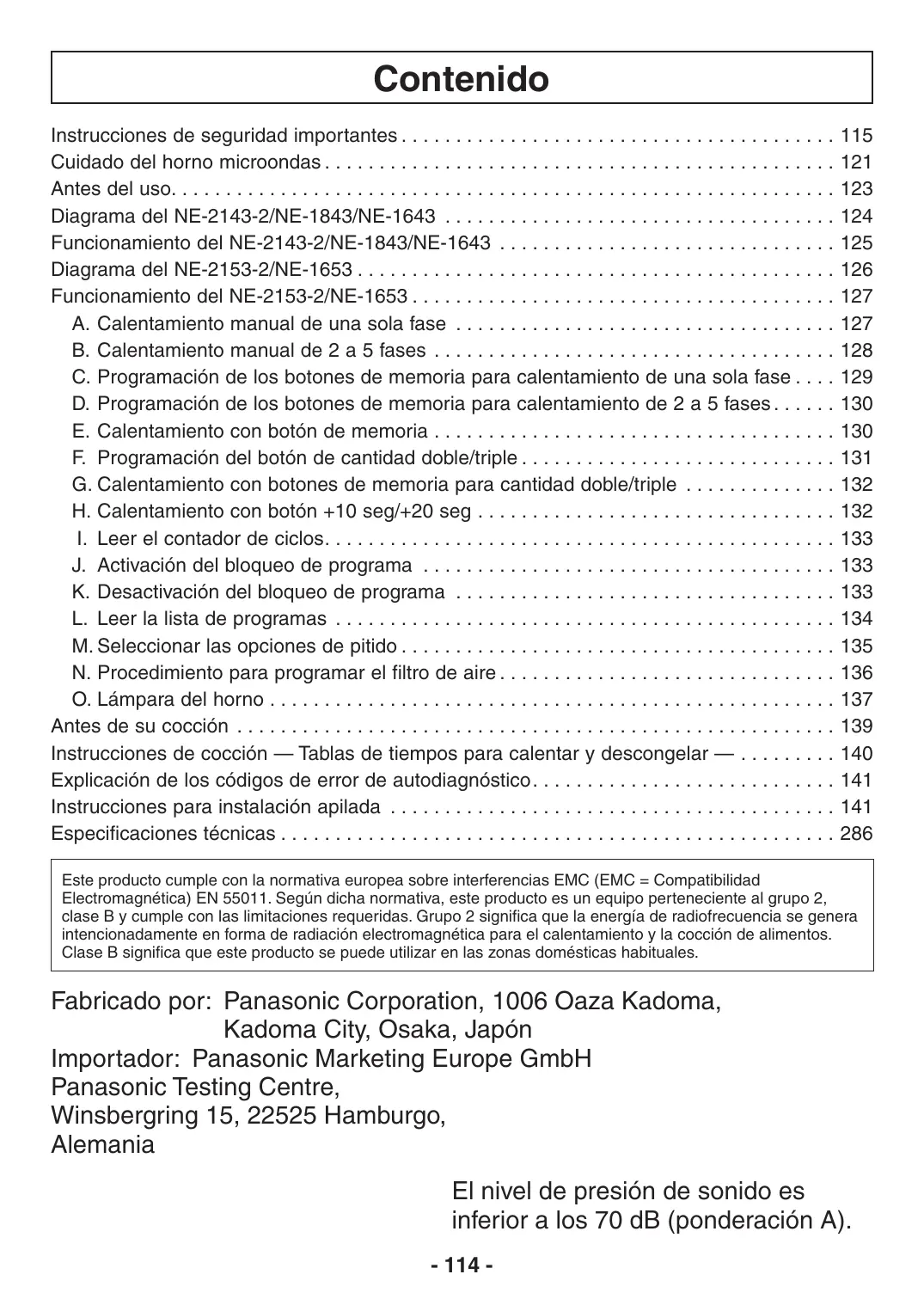 Kadoma City, Osaka, Japón Importador: Panasonic Marketing Europe GmbH Panasonic Testing Centre, Winsbergring 15, 22525 Hamburgo, Alemania El nivel de presión de sonido es inferior a los 70 dB (ponderación A). - 114 -