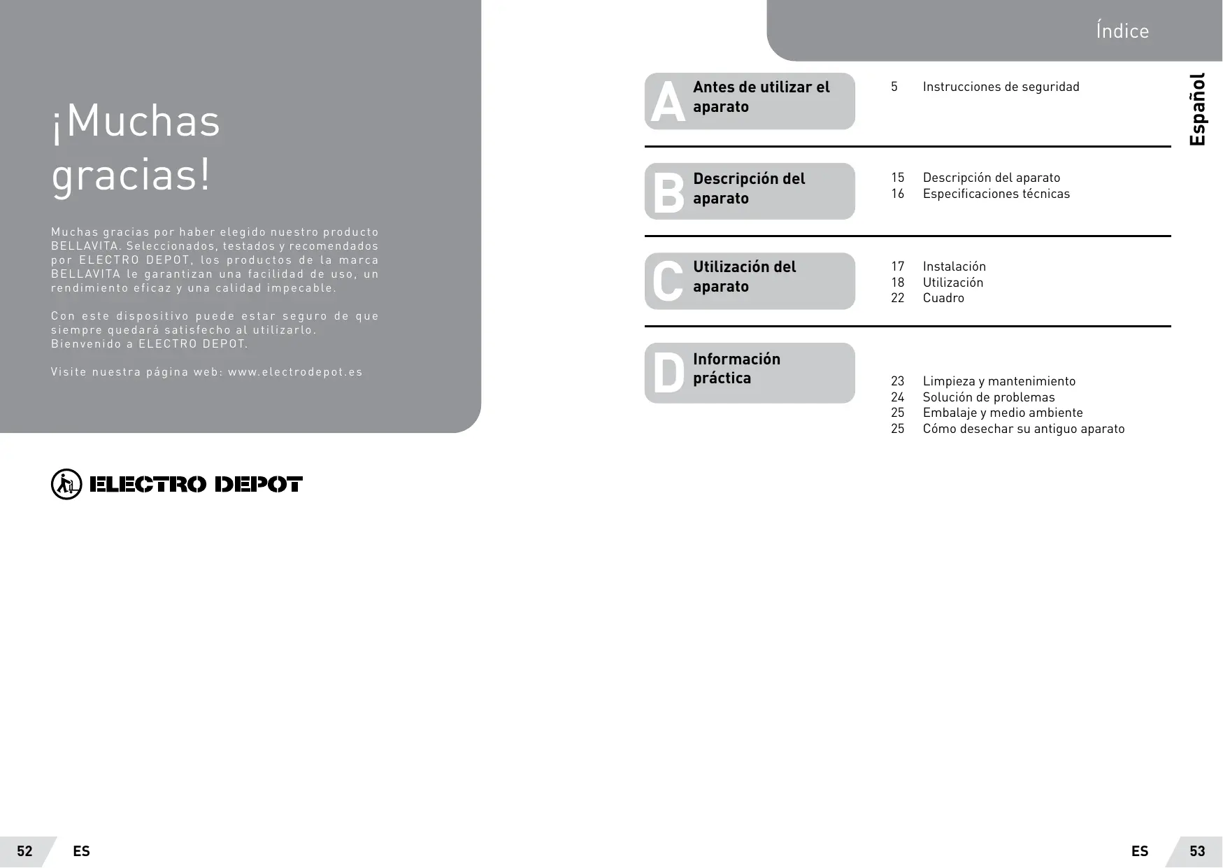 Presentación del aparato Español Especificaciones técnicas Utilización del aparato Instalación Modelo
