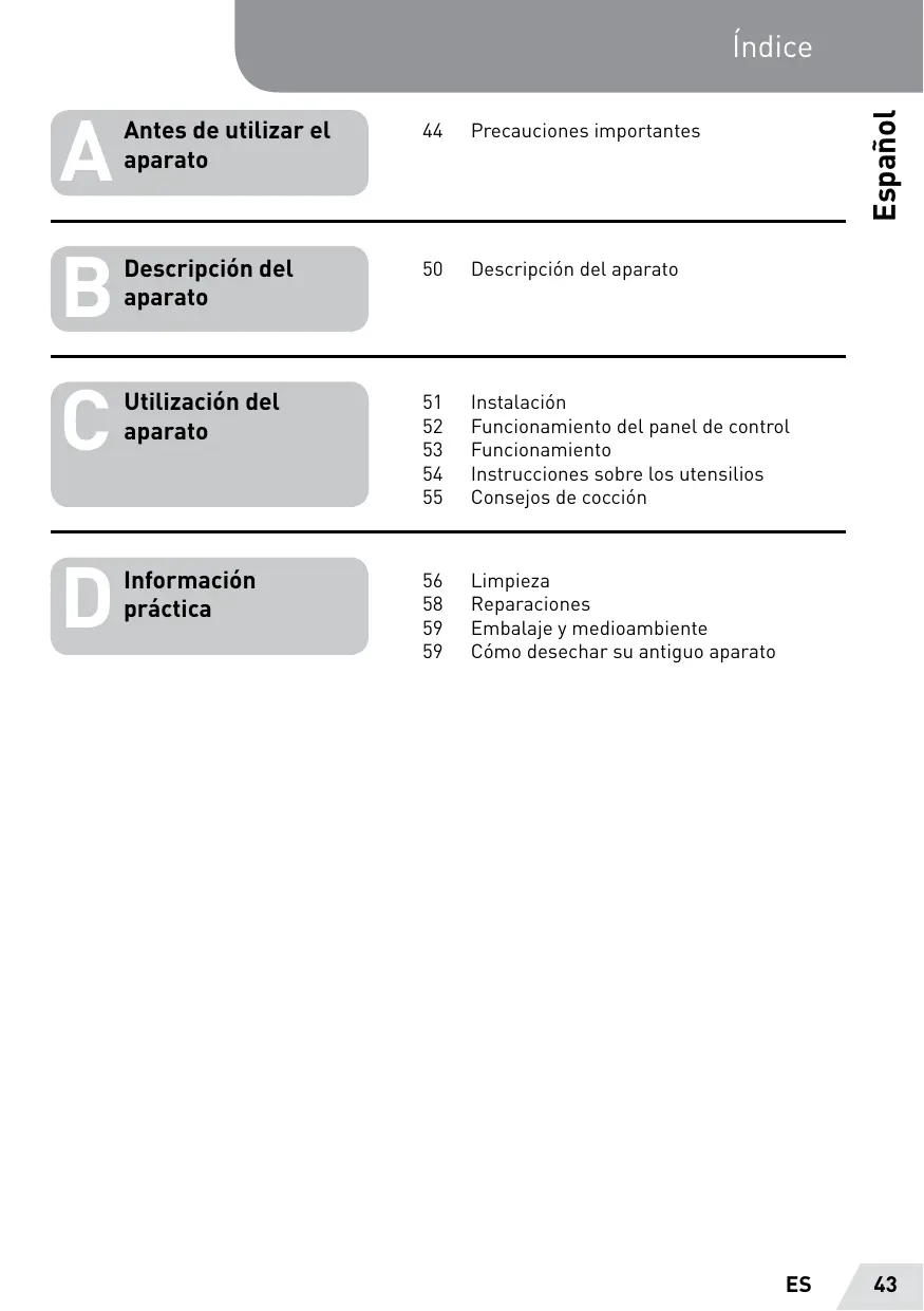 Español Información práctica Cómo desechar su antiguo aparato RECOGIDA SELECTIVA DE RESIDUOS DE APARATOS ELÉCTRICOS Y ELECTRÓNICOS Este aparato lleva el símbolo RAEE (Residuos de Aparatos Eléctricos y Electrónicos) que significa que al final de su vida útil, no debe tirarse a la basura, sino que debe depositarse en la unidad de clasificación de residuos de su localidad. La valorización de los residuos permite contribuir a conservar nuestro medio ambiente. PROTECCIÓN DEL MEDIO AMBIENTE - DIRECTIVA 2012/19/EU Para preservar nuestro medio ambiente y nuestra salud, la eliminación de los aparatos eléctricos y electrónicos al final de su vida útil debe hacerse según normas muy precisas y requiere la implicación de todos, tanto del proveedor como del usuario. Es por ello que su aparato, tal y como señala el símbolo que se encuentra en su placa de características o en su embalaje, no debe, bajo ningún concepto, tirarse a un contenedor público o privado de residuos domésticos. El usuario tiene derecho a depositar el aparato en un lugar público de recogida selectiva de residuos para que sea reciclado o reutilizado para otras aplicaciones de conformidad con la directiva. Por la seguridad de los niños, guarde sus aparatos en un lugar seguro hasta que pueda eliminarlos, preferentemente fuera de su domicilio.