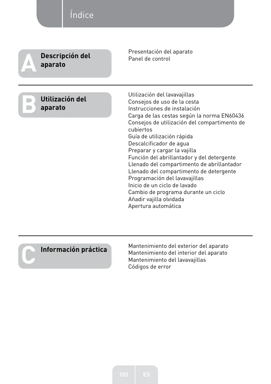 Consejos de uso de la cesta Instrucciones de instalación Carga de las cestas según la norma EN60436 Consejos de utilización del compartimento de cubiertos Guía de utilización rápida Descalcificador de agua Preparar y cargar la vajilla Función del abrillantador y del detergente Llenado del compartimento de abrillantador Llenado del compartimento de detergente Programación del lavavajillas Inicio de un ciclo de lavado Cambio de programa durante un ciclo Añadir vajilla olvidada Apertura automática