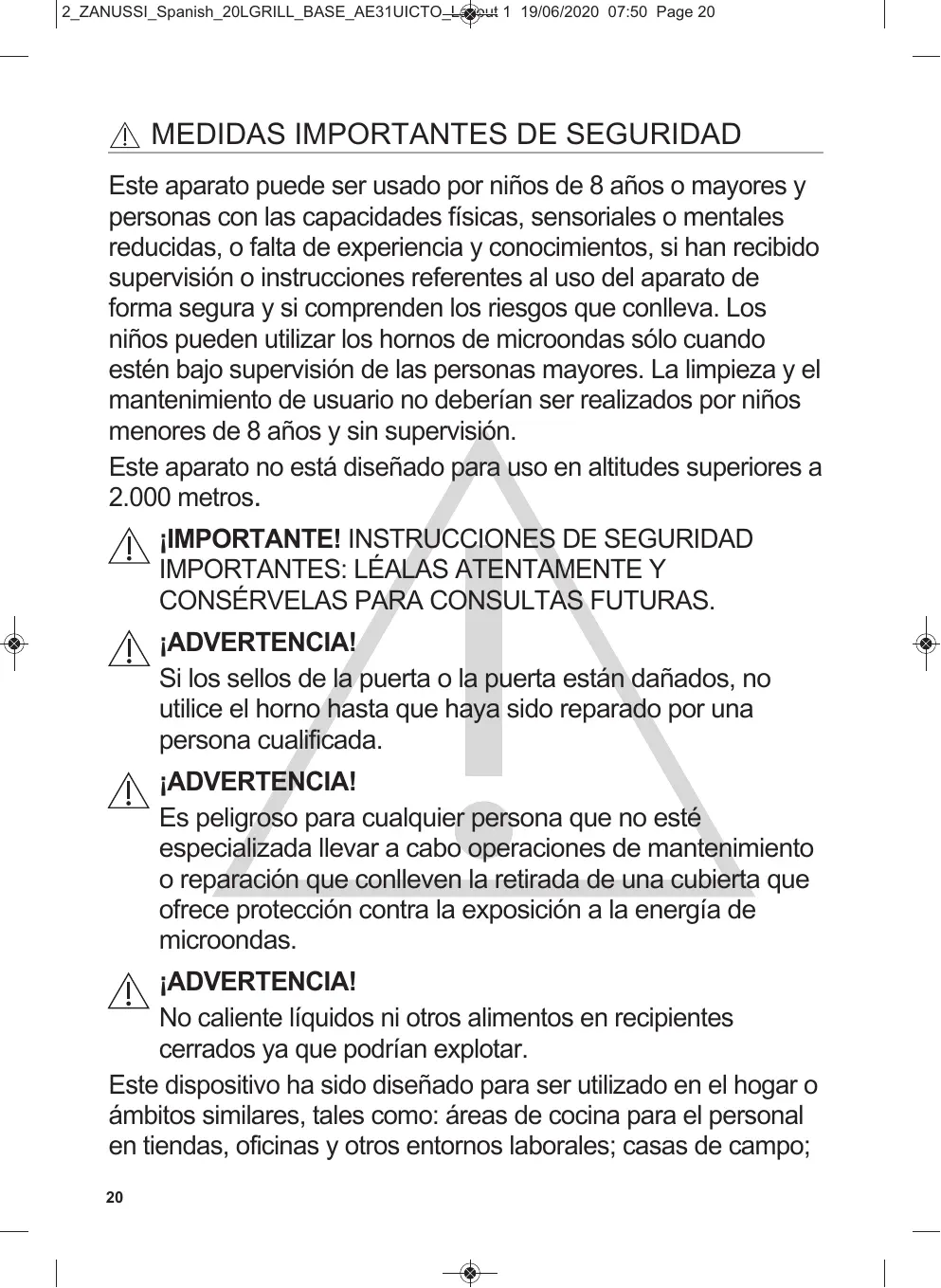 Medidas iMportantes de seguridad este aparato puede ser usado por niños de 8 años o mayores y personas con las capacidades físicas, sensoriales o mentales reducidas, o falta de experiencia y conocimientos, si han recibido supervisión o instrucciones referentes al uso del aparato de forma segura y si comprenden los riesgos que conlleva. los niños pueden utilizar los hornos de microondas sólo cuando estén bajo supervisión de las personas mayores. la limpieza y el mantenimiento de usuario no deberían ser realizados por niños menores de 8 años y sin supervisión. este aparato no está diseñado para uso en altitudes superiores a