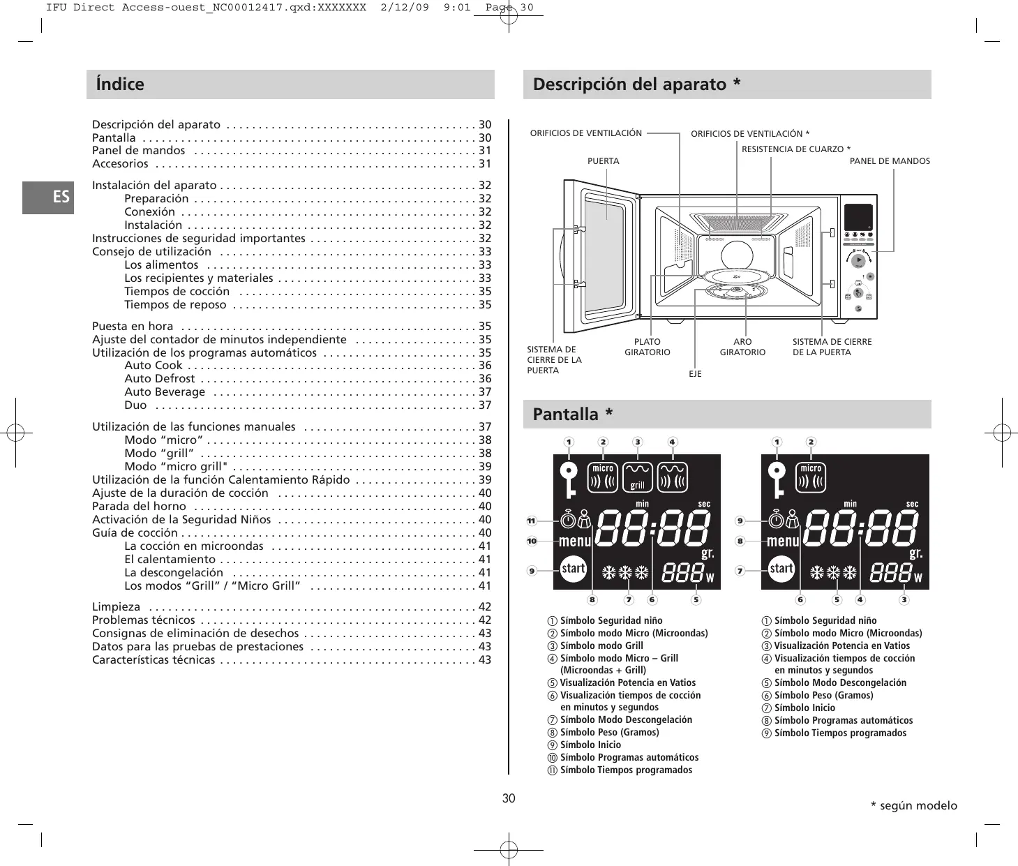 햲 Símbolo Seguridad niño 햳 Símbolo modo Micro (Microondas) 햴 Símbolo modo Grill 햵 Símbolo modo Micro – Grill (Microondas + Grill) 햶 Visualización Potencia en Vatios 햷 Visualización tiempos de cocción en minutos y segundos 햸 Símbolo Modo Descongelación 햹 Símbolo Peso (Gramos) 햺 Símbolo Inicio 햻 Símbolo Programas automáticos 햽 Símbolo Tiempos programados