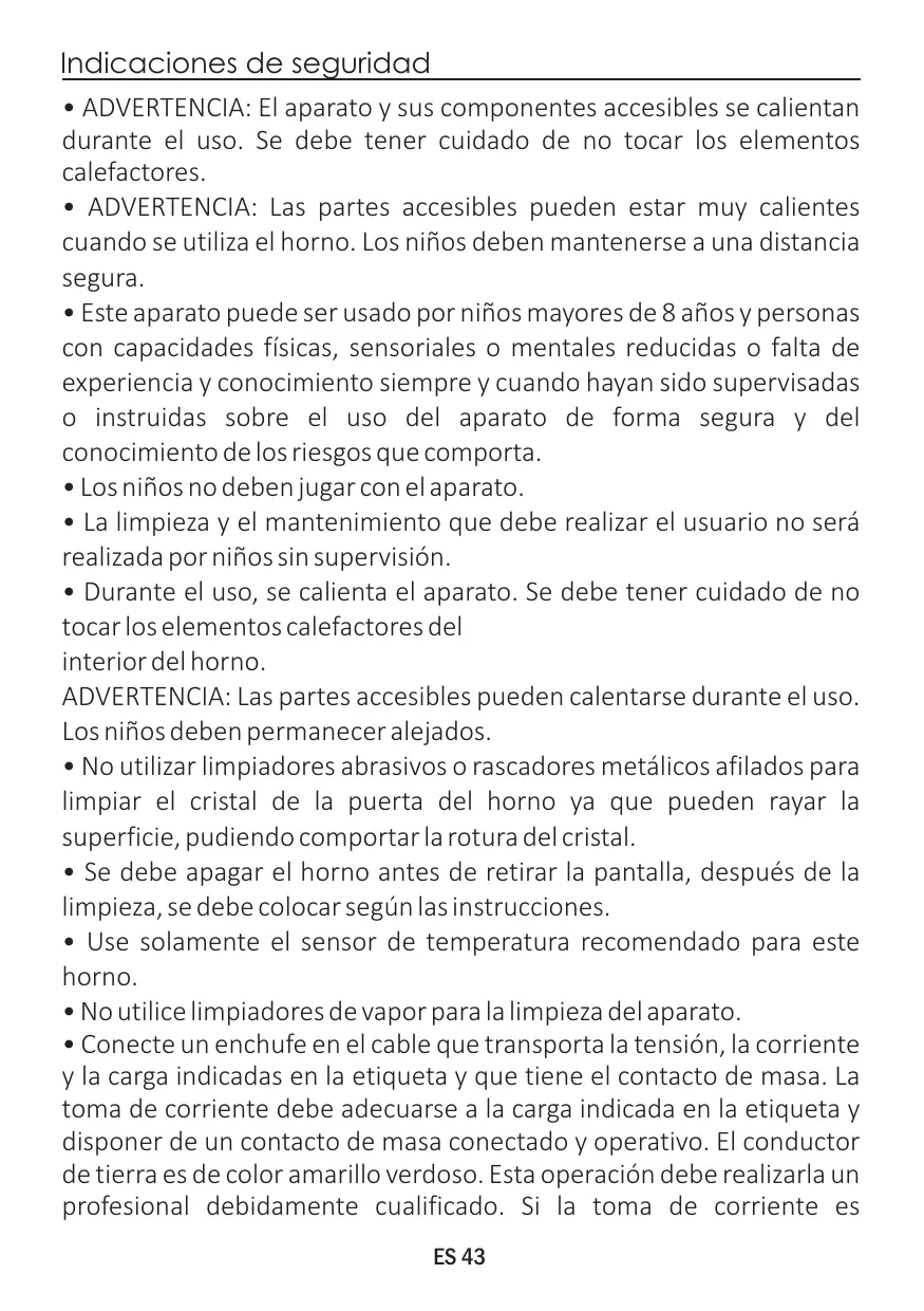 Indicaciones de seguridad • ADVERTENCIA: El aparato y sus componentes accesibles se calientan durante el uso. Se debe tener cuidado de no tocar los elementos calefactores. • ADVERTENCIA: Las partes accesibles pueden estar muy calientes cuando se utiliza el horno. Los niños deben mantenerse a una distancia segura. • Este aparato puede ser usado por niños mayores de 8 años y personas con capacidades físicas, sensoriales o mentales reducidas o falta de experiencia y conocimiento siempre y cuando hayan sido supervisadas o instruidas sobre el uso del aparato de forma segura y del conocimiento de los riesgos que comporta. • Los niños no deben jugar con el aparato. • La limpieza y el mantenimiento que debe realizar el usuario no será realizada por niños sin supervisión. • Durante el uso, se calienta el aparato. Se debe tener cuidado de no tocar los elementos calefactores del interior del horno. ADVERTENCIA: Las partes accesibles pueden calentarse durante el uso. Los niños deben permanecer alejados. • No utilizar limpiadores abrasivos o rascadores metálicos afilados para limpiar el cristal de la puerta del horno ya que pueden rayar la superficie, pudiendo comportar la rotura del cristal. • Se debe apagar el horno antes de retirar la pantalla, después de la limpieza, se debe colocar según las instrucciones. • Use solamente el sensor de temperatura recomendado para este horno. • No utilice limpiadores de vapor para la limpieza del aparato. • Conecte un enchufe en el cable que transporta la tensión, la corriente y la carga indicadas en la etiqueta y que tiene el contacto de masa. La toma de corriente debe adecuarse a la carga indicada en la etiqueta y disponer de un contacto de masa conectado y operativo. El conductor de tierra es de color amarillo verdoso. Esta operación debe realizarla un profesional debidamente cualificado. Si la toma de corriente es ES 43