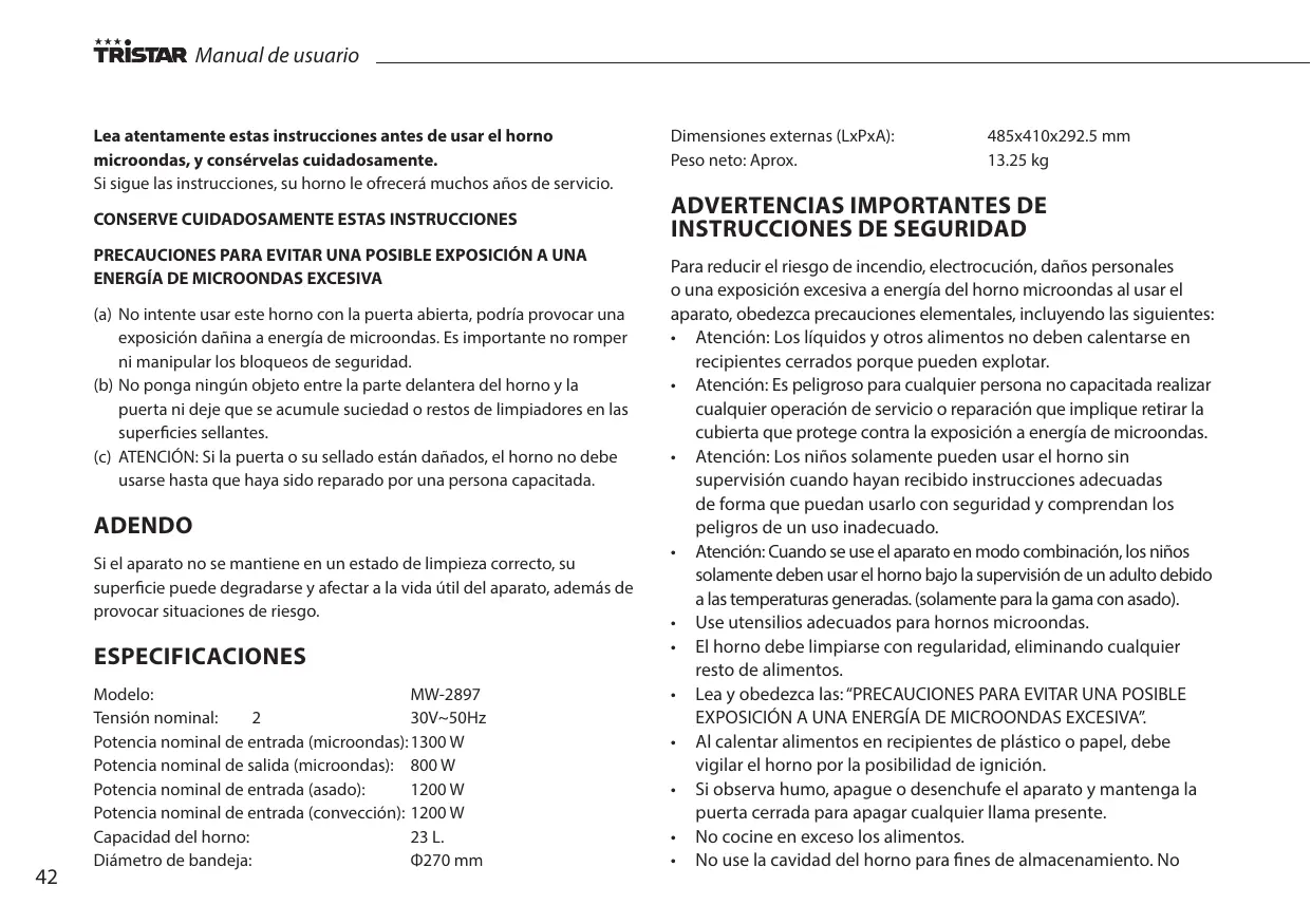 MW-2897 - Microonda TRISTAR - Manual de uso y guía de instrucciones gratis