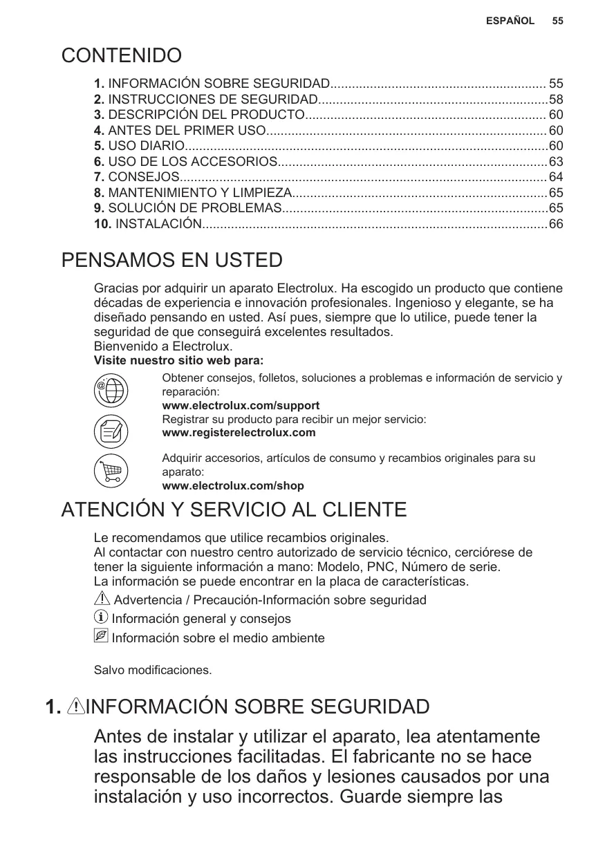PENSAMOS EN USTED Gracias por adquirir un aparato Electrolux. Ha escogido un producto que contiene décadas de experiencia e innovación profesionales. Ingenioso y elegante, se ha diseñado pensando en usted. Así pues, siempre que lo utilice, puede tener la seguridad de que conseguirá excelentes resultados. Bienvenido a Electrolux. Visite nuestro sitio web para: