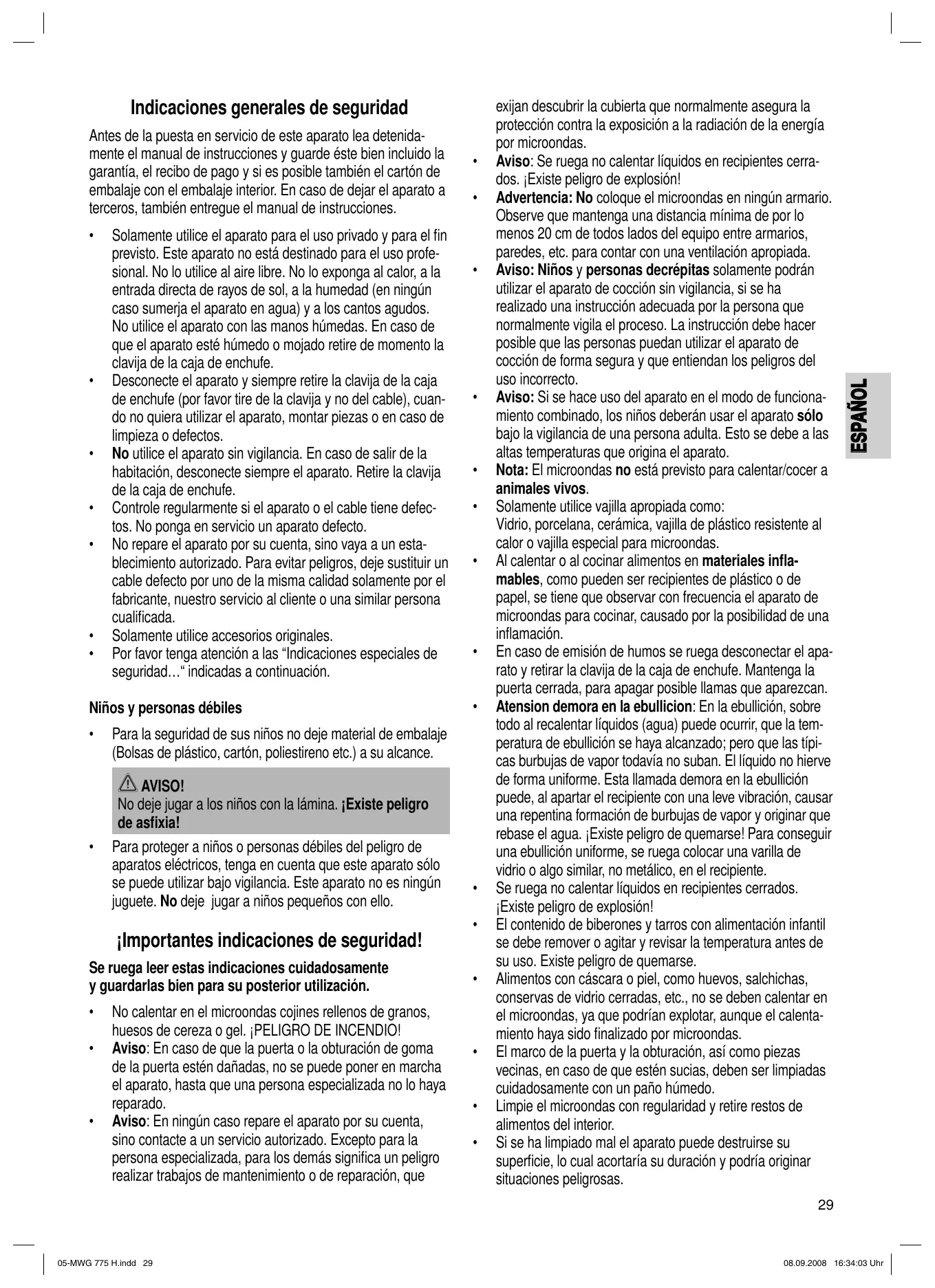 Aviso: Se ruega no calentar líquidos en recipientes cerrados. ¡Existe peligro de explosión! Advertencia: No coloque el microondas en ningún armario. Observe que mantenga una distancia mínima de por lo menos 20 cm de todos lados del equipo entre armarios, paredes, etc. para contar con una ventilación apropiada. Aviso: Niños y personas decrépitas solamente podrán utilizar el aparato de cocción sin vigilancia, si se ha realizado una instrucción adecuada por la persona que normalmente vigila el proceso. La instrucción debe hacer posible que las personas puedan utilizar el aparato de cocción de forma segura y que entiendan los peligros del uso incorrecto. Aviso: Si se hace uso del aparato en el modo de funcionamiento combinado, los niños deberán usar el aparato sólo bajo la vigilancia de una persona adulta. Esto se debe a las altas temperaturas que origina el aparato. Nota: El microondas no está previsto para calentar/cocer a animales vivos. Solamente utilice vajilla apropiada como: Vidrio, porcelana, cerámica, vajilla de plástico resistente al calor o vajilla especial para microondas. Al calentar o al cocinar alimentos en materiales inflamables, como pueden ser recipientes de plástico o de papel, se tiene que observar con frecuencia el aparato de microondas para cocinar, causado por la posibilidad de una inflamación. En caso de emisión de humos se ruega desconectar el aparato y retirar la clavija de la caja de enchufe. Mantenga la puerta cerrada, para apagar posible llamas que aparezcan. Atension demora en la ebullicion: En la ebullición, sobre todo al recalentar líquidos (agua) puede ocurrir, que la temperatura de ebullición se haya alcanzado; pero que las típicas burbujas de vapor todavía no suban. El líquido no hierve de forma uniforme. Esta llamada demora en la ebullición puede, al apartar el recipiente con una leve vibración, causar una repentina formación de burbujas de vapor y originar que rebase el agua. ¡Existe peligro de quemarse! Para conseguir una ebullición uniforme, se ruega colocar una varilla de vidrio o algo similar, no metálico, en el recipiente. Se ruega no calentar líquidos en recipientes cerrados. ¡Existe peligro de explosión! El contenido de biberones y tarros con alimentación infantil se debe remover o agitar y revisar la temperatura antes de su uso. Existe peligro de quemarse. Alimentos con cáscara o piel, como huevos, salchichas, conservas de vidrio cerradas, etc., no se deben calentar en el microondas, ya que podrían explotar, aunque el calentamiento haya sido finalizado por microondas. El marco de la puerta y la obturación, así como piezas vecinas, en caso de que estén sucias, deben ser limpiadas cuidadosamente con un paño húmedo. Limpie el microondas con regularidad y retire restos de alimentos del interior. Si se ha limpiado mal el aparato puede destruirse su superficie, lo cual acortaría su duración y podría originar situaciones peligrosas.