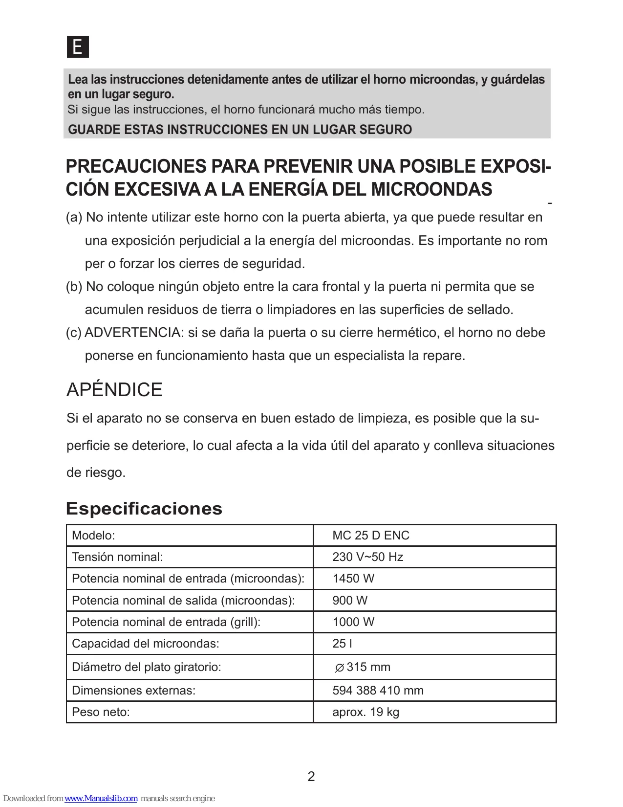 una exposición perjudicial a la energía del microondas. Es importante no rom per o forzar los cierres de seguridad. (b) No coloque ningún objeto entre la cara frontal y la puerta ni permita que se acumulen residuos de tierra o limpiadores en las superficies de sellado. (c) ADVERTENCIA: si se daña la puerta o su cierre hermético, el horno no debe ponerse en funcionamiento hasta que un especialista la repare. APÉNDICE Si el aparato no se conserva en buen estado de limpieza, es posible que la superficie se deteriore, lo cual afecta a la vida útil del aparato y conlleva situaciones de riesgo. Especificaciones Modelo: