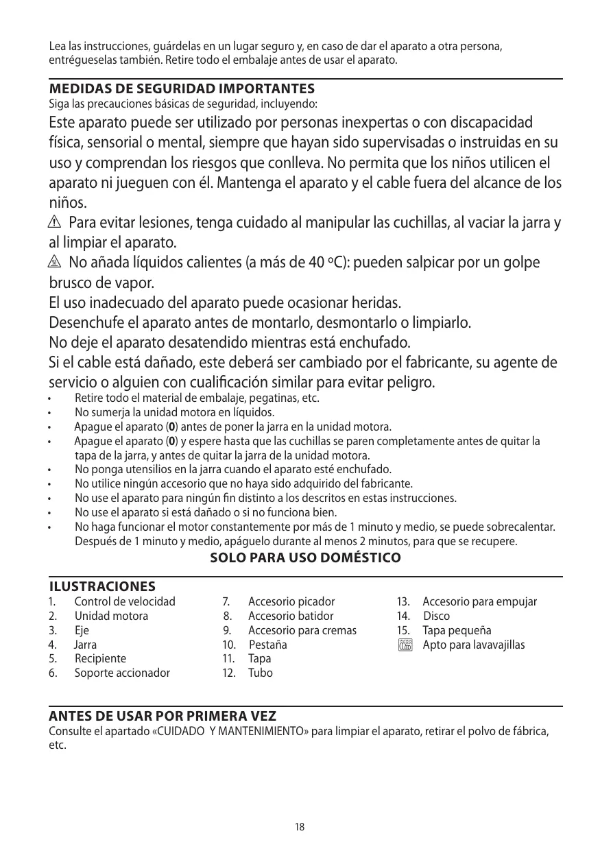 Este aparato puede ser utilizado por personas inexpertas o con discapacidad física, sensorial o mental, siempre que hayan sido supervisadas o instruidas en su uso y comprendan los riesgos que conlleva. No permita que los niños utilicen el aparato ni jueguen con él. Mantenga el aparato y el cable fuera del alcance de los niños. c Para evitar lesiones, tenga cuidado al manipular las cuchillas, al vaciar la jarra y al limpiar el aparato. h No añada líquidos calientes (a más de 40 ºC): pueden salpicar por un golpe brusco de vapor.