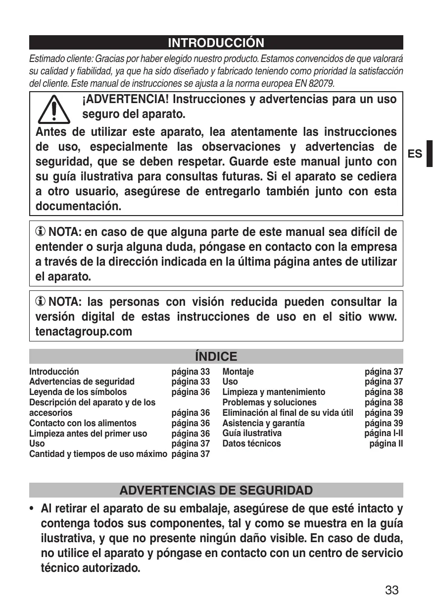 REMARQUE : les personnes mal voyantes peuvent consulter la version numérique de ce mode d’emploi sur le site internet www. tenactagroup.com Introduction Consignes de sécurité Légende des symboles utilisés Description de l’appareil et de ses accessoires Contact avec les aliments Nettoyage avant la première utilisation Utilisation Quantités et durées d'utilisation maximum