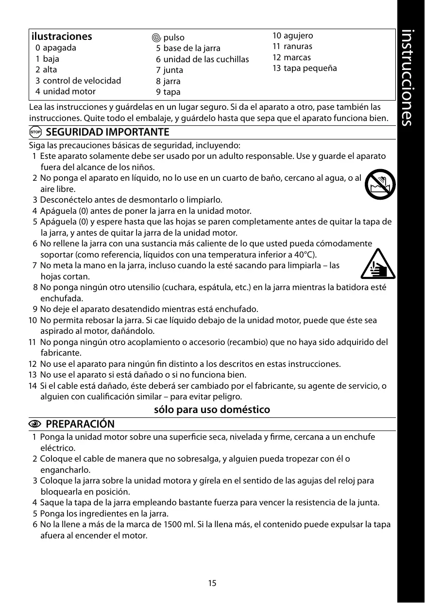 1 Este aparato solamente debe ser usado por un adulto responsable. Use y guarde el aparato fuera del alcance de los niños. 2 No ponga el aparato en líquido, no lo use en un cuarto de baño, cercano al agua, o al aire libre. 3 Desconéctelo antes de desmontarlo o limpiarlo. 4 Apáguela (0) antes de poner la jarra en la unidad motor. 5 Apáguela (0) y espere hasta que las hojas se paren completamente antes de quitar la tapa de la jarra, y antes de quitar la jarra de la unidad motor. 6 No rellene la jarra con una sustancia más caliente de lo que usted pueda cómodamente soportar (como referencia, líquidos con una temperatura inferior a 40°C). 7 No meta la mano en la jarra, incluso cuando la esté sacando para limpiarla – las hojas cortan. 8 No ponga ningún otro utensilio (cuchara, espátula, etc.) en la jarra mientras la batidora esté enchufada. 9 No deje el aparato desatendido mientras está enchufado. 10 No permita rebosar la jarra. Si cae líquido debajo de la unidad motor, puede que éste sea aspirado al motor, dañándolo. 11 No ponga ningún otro acoplamiento o accesorio (recambio) que no haya sido adquirido del fabricante. 12 No use el aparato para ningún fin distinto a los descritos en estas instrucciones. 13 No use el aparato si está dañado o si no funciona bien. 14 Si el cable está dañado, éste deberá ser cambiado por el fabricante, su agente de servicio, o alguien con cualificación similar – para evitar peligro.