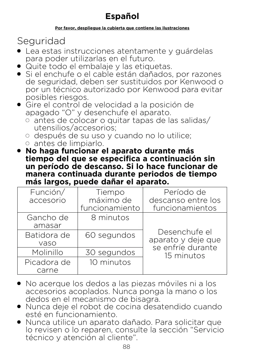 O Quite todo el embalaje y las etiquetas. O Si el enchufe o el cable están dañados, por razones de seguridad, deben ser sustituidos por Kenwood o por un técnico autorizado por Kenwood para evitar posibles riesgos. O Gire el control de velocidad a la posición de apagado “O” y desenchufe el aparato. O antes de colocar o quitar tapas de las salidas/ utensilios/accesorios; O después de su uso y cuando no lo utilice; O antes de limpiarlo. O No haga funcionar el aparato durante más tiempo del que se especifica a continuación sin un período de descanso. Si lo hace funcionar de manera continuada durante periodos de tiempo más largos, puede dañar el aparato. Función/ Tiempo Período de accesorio máximo de descanso entre los funcionamiento funcionamientos Gancho de 8 minutos amasar Desenchufe el Batidora de 60 segundos aparato y deje que vaso se enfríe durante Molinillo 30 segundos 15 minutos Picadora de 10 minutos carne