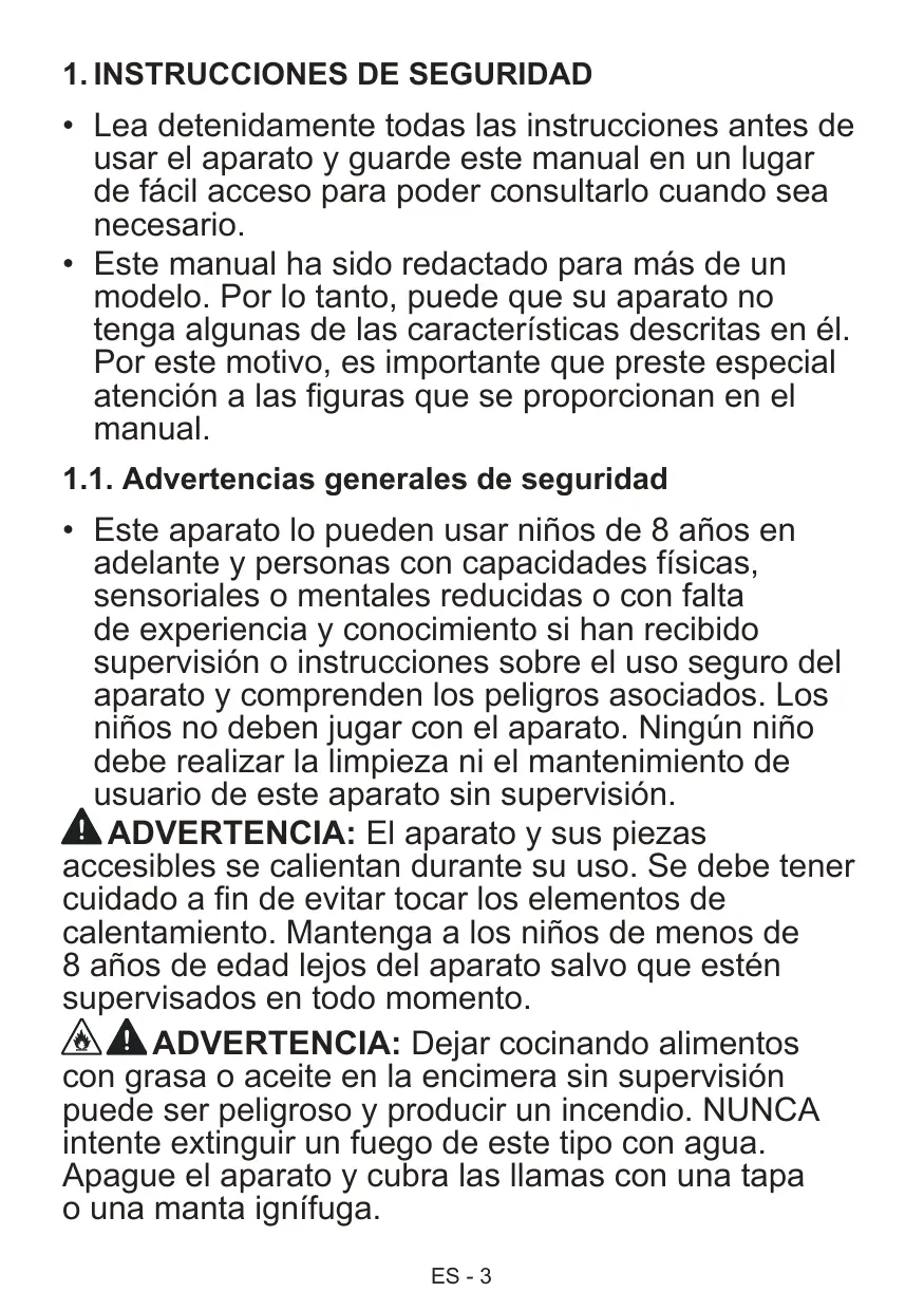 ADVERTENCIA: El aparato y sus piezas accesibles se calientan durante su uso. Se debe tener cuidado a fin de evitar tocar los elementos de calentamiento. Mantenga a los niños de menos de 8 años de edad lejos del aparato salvo que estén supervisados en todo momento. ADVERTENCIA: Dejar cocinando alimentos con grasa o aceite en la encimera sin supervisión puede ser peligroso y producir un incendio. NUNCA intente extinguir un fuego de este tipo con agua. Apague el aparato y cubra las llamas con una tapa o una manta ignífuga. ES - 3