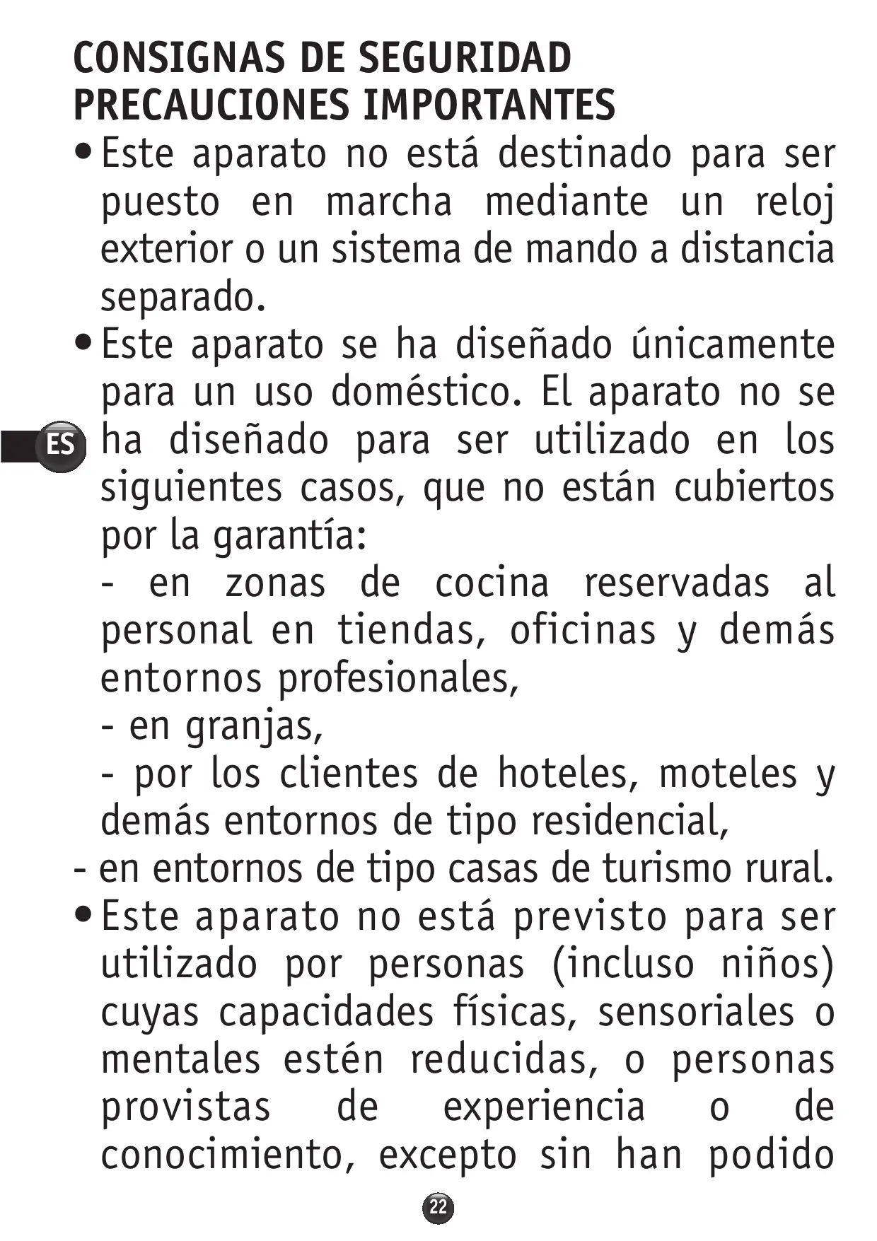 • Este aparato no está destinado para ser puesto en marcha mediante un reloj exterior o un sistema de mando a distancia separado. • Este aparato se ha diseñado únicamente para un uso doméstico. El aparato no se ES ha diseñado para ser utilizado en los siguientes casos, que no están cubiertos por la garantía: - en zonas de cocina reservadas al personal en tiendas, oficinas y demás entornos profesionales, - en granjas, - por los clientes de hoteles, moteles y demás entornos de tipo residencial, - en entornos de tipo casas de turismo rural. • Este aparato no está previsto para ser utilizado por personas (incluso niños) cuyas capacidades físicas, sensoriales o mentales estén reducidas, o personas provistas de experiencia o de conocimiento, excepto sin han podido 22