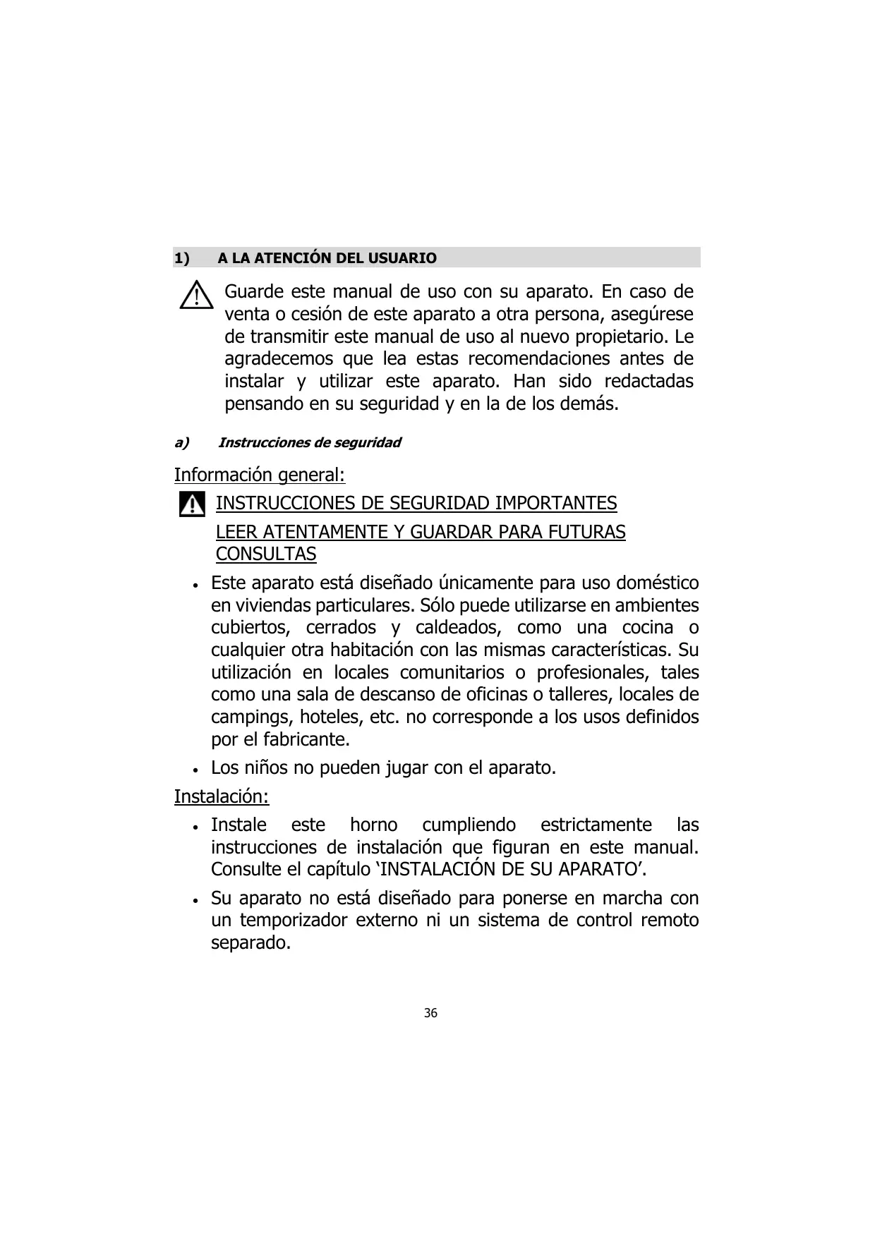 A LA ATENCIÓN DEL USUARIO Guarde este manual de uso con su aparato. En caso de venta o cesión de este aparato a otra persona, asegúrese de transmitir este manual de uso al nuevo propietario. Le agradecemos que lea estas recomendaciones antes de instalar y utilizar este aparato. Han sido redactadas pensando en su seguridad y en la de los demás. a)