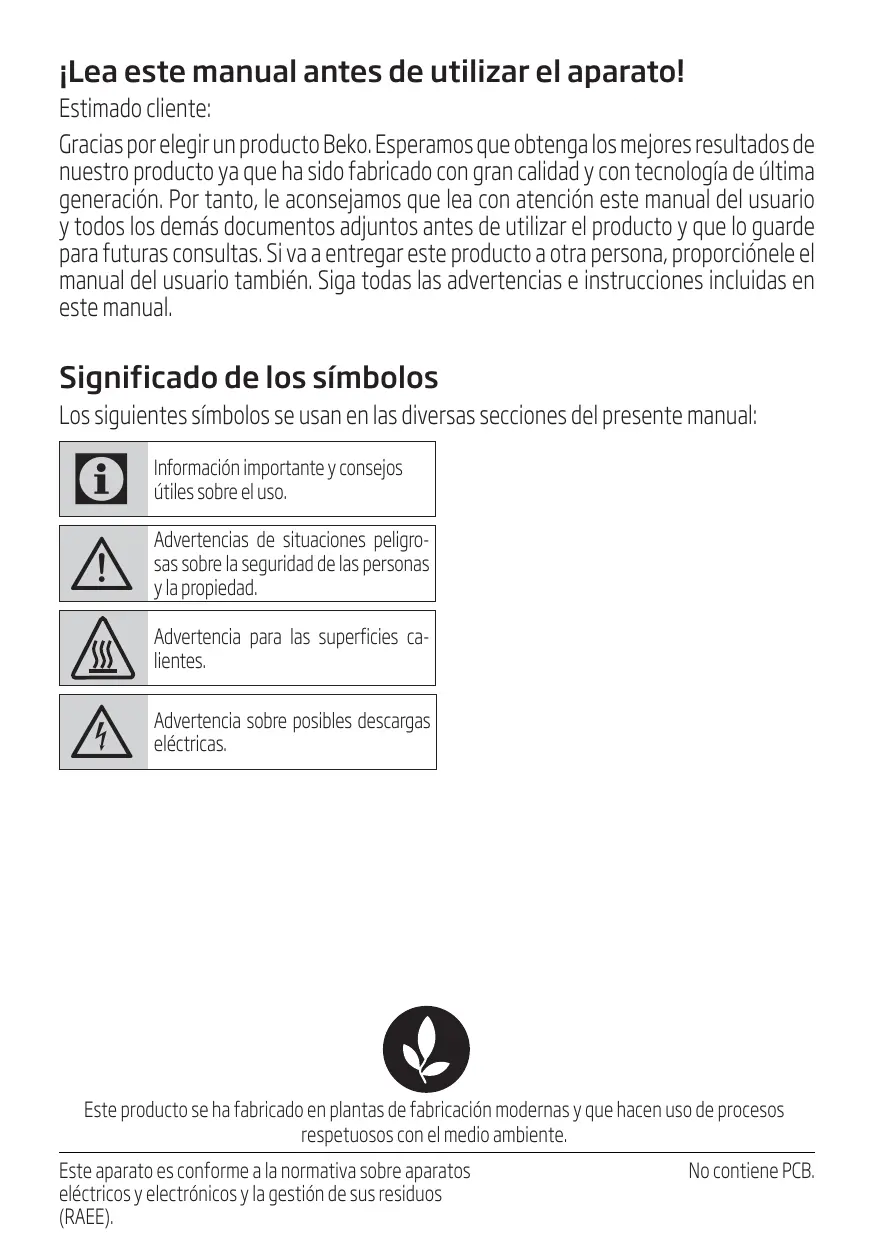 Ustensiles de cuisine en papier Oui Non Non Plateau métallique Non Oui Non Rack métallique Non Oui Non ¡Lea este manual antes de utilizar el aparato! Estimado cliente: Gracias por elegir un producto Beko. Esperamos que obtenga los mejores resultados de nuestro producto ya que ha sido fabricado con gran calidad y con tecnología de última generación. Por tanto, le aconsejamos que lea con atención este manual del usuario y todos los demás documentos adjuntos antes de utilizar el producto y que lo guarde para futuras consultas. Si va a entregar este producto a otra persona, proporciónele el manual del usuario también. Siga todas las advertencias e instrucciones incluidas en este manual. Significado de los símbolos Los siguientes símbolos se usan en las diversas secciones del presente manual: