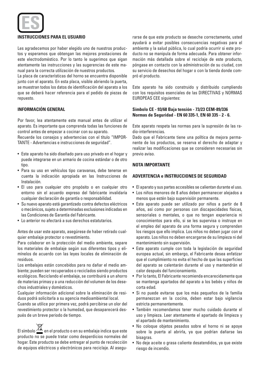 Este aparato ha sido construido y distribuido cumpliendo con los requisitos esenciales de las DIRECTIVAS y NORMAS EUROPEAS CEE siguientes: Símbolo CE - 93/68 Baja tensión - 73/23 CEM-89/336 Normas de Seguridad - EN 60 335-1, EN 60 335 - 2 - 6. Este aparato respeta las normas para la supresión de las radio-interferencias. Dado que el Fabricante tiene una política de mejora permanente de los productos, se reserva el derecho de adaptar y realizar las modificaciones que se consideren necesarias sin previo aviso. NOTA IMPORTANTE ADVERTENCIA e INSTRUCCIONES DE SEGURIDAD • El aparato y sus partes accesibles se calientan durante el uso. • Los niños menores de 8 años deben permanecer alejados a menos que estén bajo supervisión permanente. • Este aparato puede ser utilizado por niños a partir de 8 años, así como por personas con discapacidades físicas, sensoriales o mentales, o que no tengan experiencia ni conocimientos para ello, si se les supervisa o instruye en el empleo del aparato de una forma segura y comprenden los riesgos que ello implica. Los niños no deben jugar con el aparato. Los niños no deben encargarse de su limpieza ni del mantenimiento sin supervisión. • Este aparato cumple con toda la legislación de seguridad europea actual, sin embargo, el Fabricante desea enfatizar que el cumplimiento no evita el hecho de que las superficies del aparato se calentarán durante el uso y mantendrán el calor después del funcionamiento. • Por lo tanto, El Fabricante recomienda encarecidamente que se mantenga apartados del aparato a los bebés y niños de corta edad. • Si no puede evitarse que los más pequeños de la familia permanezcan en la cocina, deben estar bajo vigilancia estricta permanentemente. • También recomendamos tener mucho cuidado durante el uso y limpieza. Leer atentamente el apartado de limpieza y el apartado de mantenimiento. • No coloque objetos pesados sobre el horno ni se apoye sobre la puerta al abrirla, ya que podrían dañarse las bisagras. • No deje aceite o grasa caliente desatendidos, ya que existe riesgo de incendio.