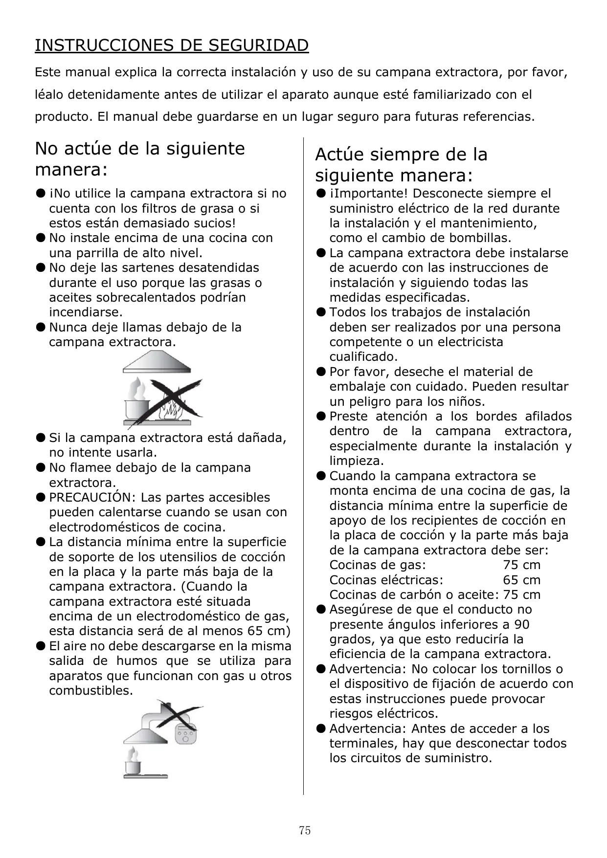 ● La campana extractora debe instalarse de acuerdo con las instrucciones de instalación y siguiendo todas las medidas especificadas. ● Todos los trabajos de instalación deben ser realizados por una persona competente o un electricista cualificado. ● Por favor, deseche el material de embalaje con cuidado. Pueden resultar un peligro para los niños. ● Preste atención a los bordes afilados dentro de la campana extractora, especialmente durante la instalación y limpieza. ● Cuando la campana extractora se monta encima de una cocina de gas, la distancia mínima entre la superficie de apoyo de los recipientes de cocción en la placa de cocción y la parte más baja de la campana extractora debe ser: 75 cm Cocinas de gas: Cocinas eléctricas: 65 cm Cocinas de carbón o aceite: 75 cm ● Asegúrese de que el conducto no presente ángulos inferiores a 90 grados, ya que esto reduciría la eficiencia de la campana extractora. ● Advertencia: No colocar los tornillos o el dispositivo de fijación de acuerdo con estas instrucciones puede provocar riesgos eléctricos. ● Advertencia: Antes de acceder a los terminales, hay que desconectar todos los circuitos de suministro.