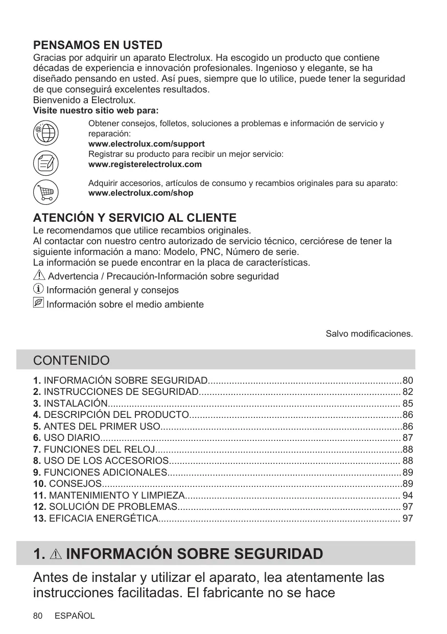 INSTALACION DESCRIPCIÔN DEL PRODUCTO. ANTES DEL PRIMER USO. USO DIARIO.. FUNCIONES DEL RELOJ. USO DE LOS ACCESORIO FUNCIONES ADICIONALES. 10. CONSEJOS. 11. MANTENIMIENTO Y LIMPIE: 12. SOLUCION DE PROBLEMA 13. EFICACIA ENERGÉTICA.