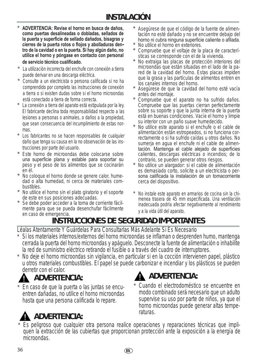 FLHUUHVGHODSXHUWDURWRVRÁRMRV\DEROODGXUDVGHQWURGHODFDYLGDGRHQODSXHUWD6LKD\DOJ~QGDxRQR XWLOLFHHOKRUQR\SyQJDVHHQFRQWDFWRFRQSHUVRQDO GHVHUYLFLRWpFQLFRFXDOLÀFDGR La utilización incorrecta del enchufe con conexión a tierra puede derivar en una descarga eléctrica. Consulte a un electricista o persona calificada si no ha comprendido por completo las instrucciones de conexión a tierra o si existen dudas sobre si el horno microondas está conectado a tierra de forma correcta. La conexión a tierra del aparato está estipulada por la ley. El fabricante declina toda responsabilidad respecto a las lesiones a personas o animales, o daños a la propiedad, que sean consecuencia del incumplimiento de estas normas. Los fabricantes no se hacen responsables de cualquier daño que tenga su causa en la no observación de las instrucciones por parte del usuario. Este horno de microondas debe colocarse sobre XQD VXSHU¿FLH SODQD \ HVWDEOH SDUD VRSRUWDU VX peso y el peso de los alimentos que se cocinarán en él. No coloque el horno donde se genere calor, humedad o alta humedad, ni cerca de materiales combustibles. No utilice el horno sin el plato giratorio y el soporte de este en sus posiciones adecuadas. Se debe poder acceder a la toma de corriente fácilmente para que se pueda desenchufar fácilmente en caso de emergencia.