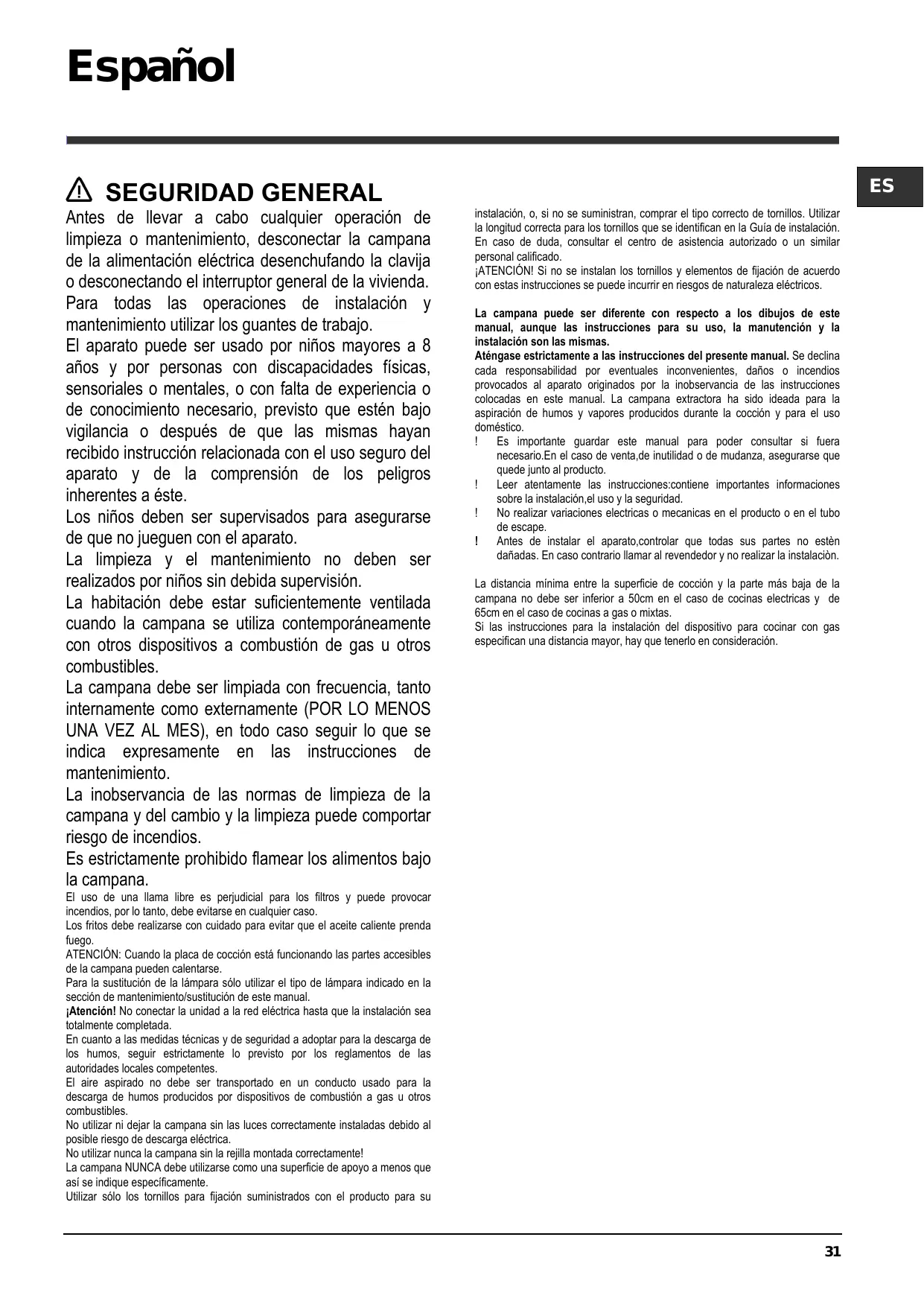 Español SEGURIDAD GENERAL Antes de llevar a cabo cualquier operación de limpieza o mantenimiento, desconectar la campana de la alimentación eléctrica desenchufando la clavija o desconectando el interruptor general de la vivienda. Para todas las operaciones de instalación y mantenimiento utilizar los guantes de trabajo. El aparato puede ser usado por niños mayores a 8 años y por personas con discapacidades físicas, sensoriales o mentales, o con falta de experiencia o de conocimiento necesario, previsto que estén bajo vigilancia o después de que las mismas hayan recibido instrucción relacionada con el uso seguro del aparato y de la comprensión de los peligros inherentes a éste. Los niños deben ser supervisados para asegurarse de que no jueguen con el aparato. La limpieza y el mantenimiento no deben ser realizados por niños sin debida supervisión. La habitación debe estar suficientemente ventilada cuando la campana se utiliza contemporáneamente con otros dispositivos a combustión de gas u otros combustibles. La campana debe ser limpiada con frecuencia, tanto internamente como externamente (POR LO MENOS UNA VEZ AL MES), en todo caso seguir lo que se indica expresamente en las instrucciones de mantenimiento. La inobservancia de las normas de limpieza de la campana y del cambio y la limpieza puede comportar riesgo de incendios. Es estrictamente prohibido flamear los alimentos bajo la campana.