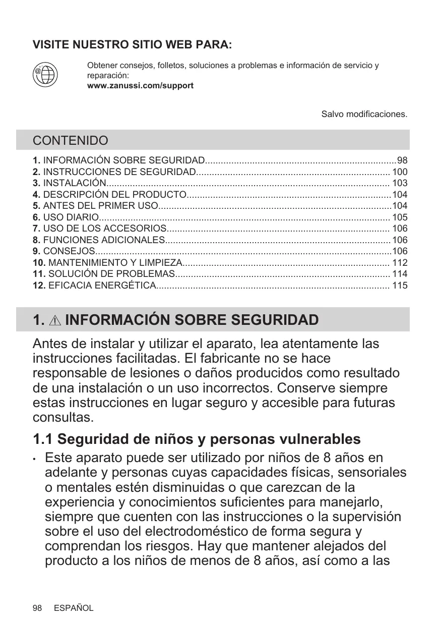 Este aparato puede ser utilizado por niños de 8 años en adelante y personas cuyas capacidades físicas, sensoriales o mentales estén disminuidas o que carezcan de la experiencia y conocimientos suficientes para manejarlo, siempre que cuenten con las instrucciones o la supervisión sobre el uso del electrodoméstico de forma segura y comprendan los riesgos. Hay que mantener alejados del producto a los niños de menos de 8 años, así como a las