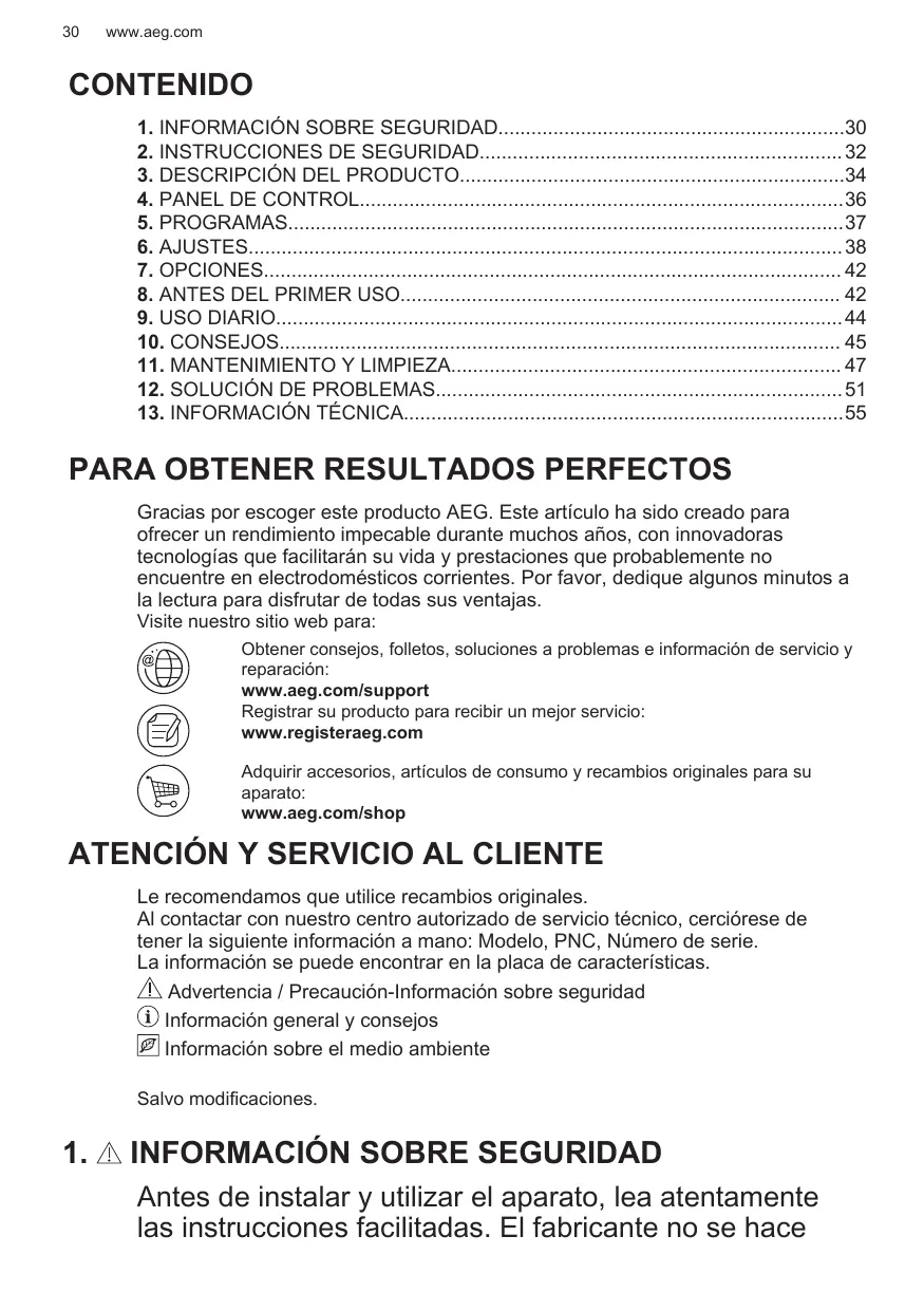Gracias por escoger este producto AEG. Este artículo ha sido creado para ofrecer un rendimiento impecable durante muchos años, con innovadoras tecnologías que facilitarán su vida y prestaciones que probablemente no encuentre en electrodomésticos corrientes. Por favor, dedique algunos minutos a la lectura para disfrutar de todas sus ventajas. Visite nuestro sitio web para: Obtener consejos, folletos, soluciones a problemas e información de servicio y reparación: www.aeg.com/support Registrar su producto para recibir un mejor servicio: www.registeraeg.com Adquirir accesorios, artículos de consumo y recambios originales para su aparato: www.aeg.com/shop