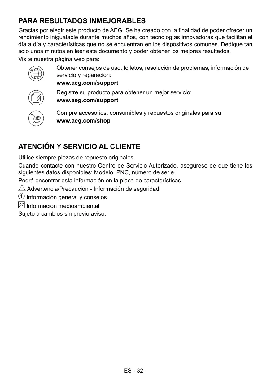 Visite nuestra página web para: Obtener consejos de uso, folletos, resolución de problemas, información de servicio y reparación: www.aeg.com/support Registre su producto para obtener un mejor servicio: www.aeg.com/support Compre accesorios, consumibles y repuestos originales para su www.aeg.com/shop